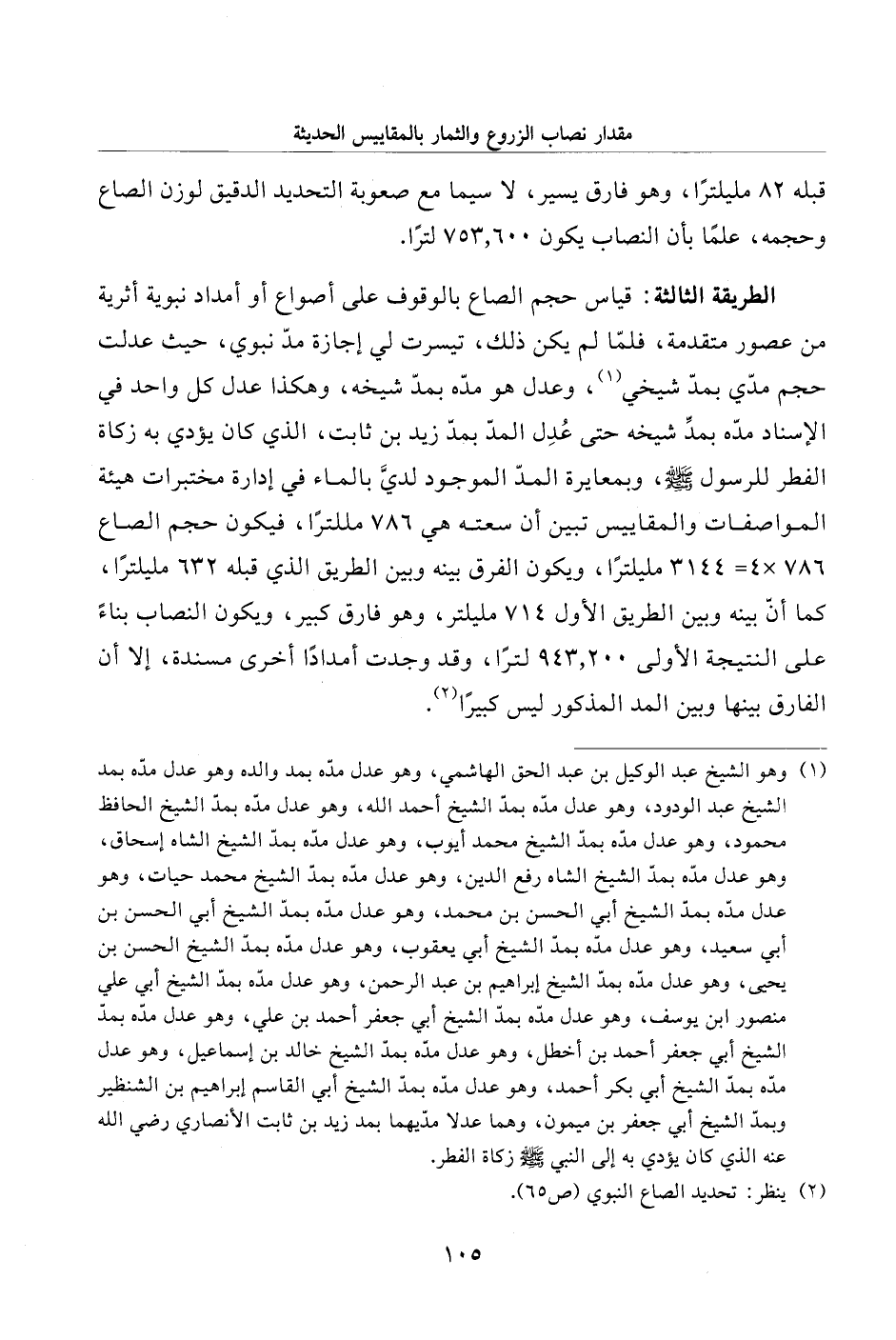 الطريقة الثالثة: قياس حجم الصاع بالوقوف على أصواع أو أمداد نبوية أثرية من عصور متقدمة، فلمّا لم يكن ذلك، تيسرت لي إجازة مدّ نبوي، حيث عدلت حجم مدّي بمدّ شيخي (¬1)، وعدل هو مدّه بمدّ شيخه، وهكذا عدل كل واحد في الإسناد مدّه بمدِّ شيخه حتى عُدِل المدّ بمدّ زيد بن ثابت، الذي كان يؤدي به زكاة الفطر للرسول - صلى الله عليه وسلم -، وبمعايرة المدّ الموجود لديَّ بالماء في إدارة مختبرات هيئة المواصفات والمقاييس تبين أن سعته هي 786 مللترًا، فيكون حجم الصاع 786 × 4 = 3144 مليلترًا، ويكون الفرق بينه وبين الطريق الذي قبله 632 مليلترًا، كما أن بينه وبين الطريق الأول 714 مليلتر، وهو فارق كبير، ويكون النصاب بناءً على النتيجة الأولى 943. 200 لترًا، وقد وجدت أمدادًا أخرى مسندة، إلا أن الفارق بينها وبين المد المذكور ليس كبيرًا (¬2).