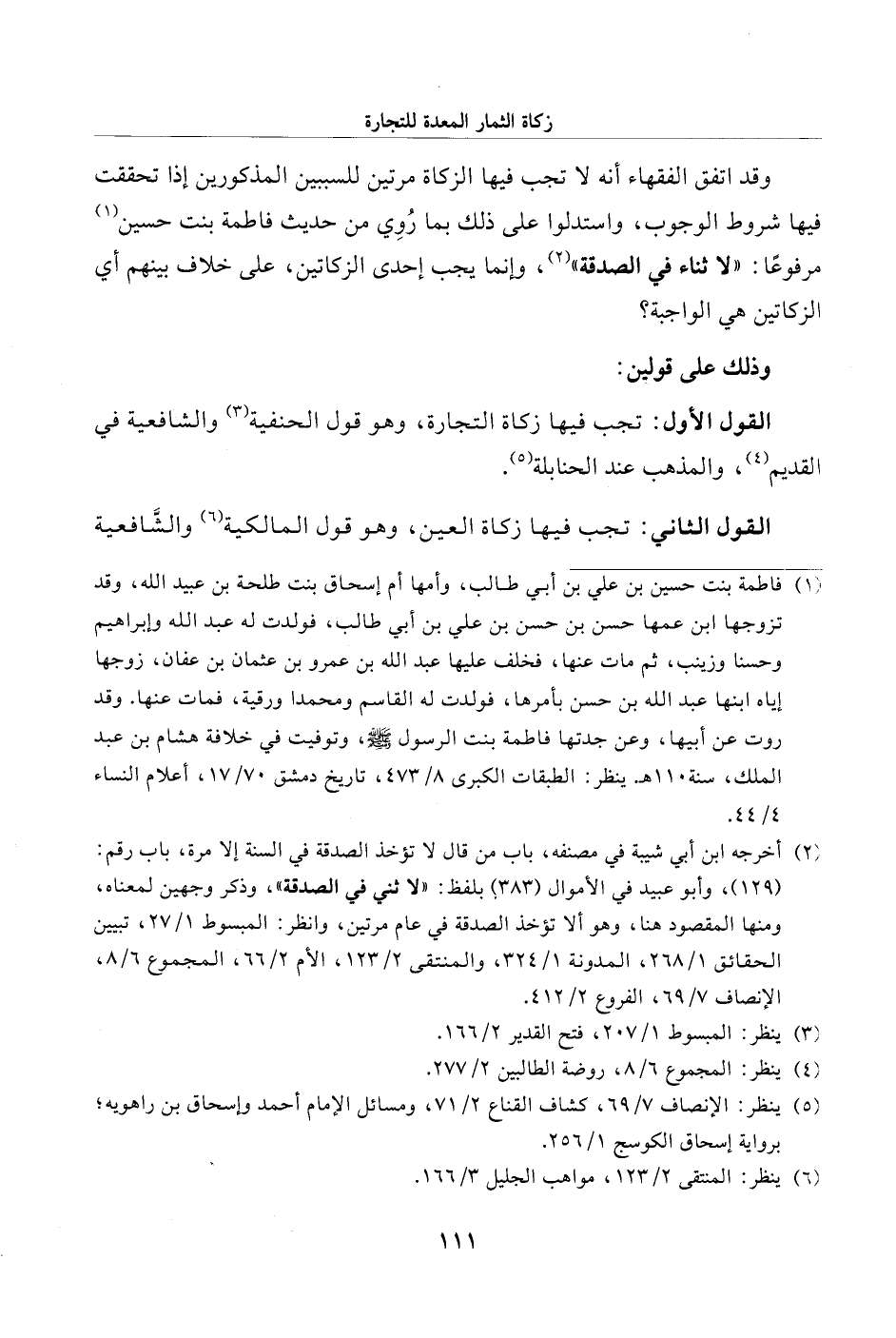 وقد اتفق الفقهاء أنه لا تجب فيها الزكاة مرتين للسببين المذكورين إذا تحققت فيها شروط الوجوب، واستدلوا على ذلك بما رُوِي من حديث فاطمة بنت حسين (¬1) مرفوعًا: "لا ثناء في الصدقه" (¬2)، وإنما يجب إحدى الزكاتين، على خلاف بينهم أي الزكاتين هي الواجبة؟