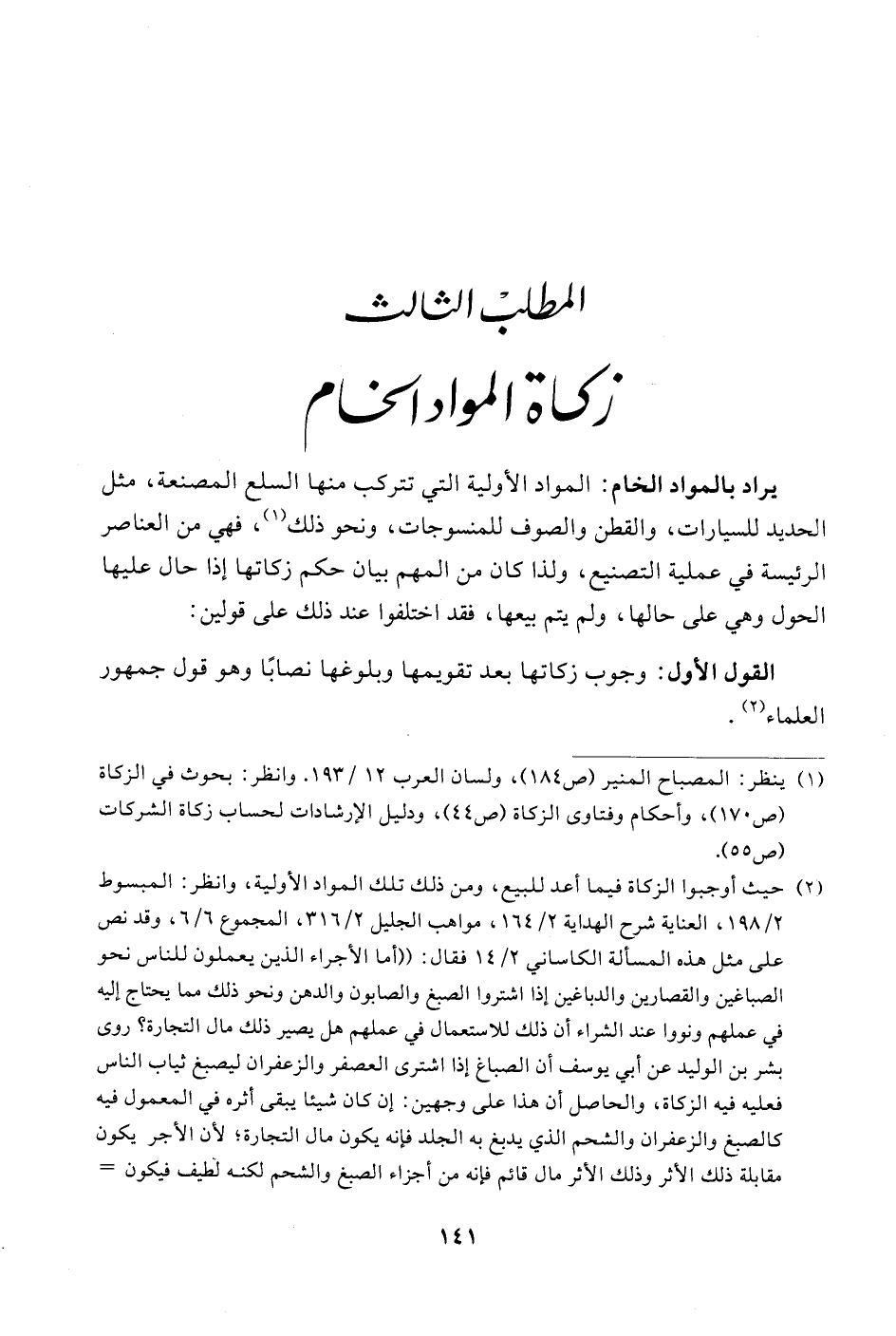 (¬2) حيث أوجبوا الزكاة فيما أعد للبيع، ومن ذلك تلك المواد الأولية، وانظر: المبسوط 2/ 198، العناية شرح الهداية 2/ 164، مواهب الجليل 2/ 316، المجموع 6/ 6، وقد نص على مثل هذه المسألة الكاساني 2/ 14 فقال: "أما الأجراء الذين يعملون للناس نحو الصباغين والقصارين والدباغين إذا اشتروا الصبغ والصابون والدهن ونحو ذلك مما يحتاج إليه في عملهم ونووا عند الشراء أن ذلك للاستعمال في عملهم هل يصير ذلك مال التجارة؟ روى بشر بن الوليد عن أبي يوسف أن الصباغ إذا اشترى العصفر والزعفران ليصبغ ثياب الناس فعليه فيه الزكاة، والحاصل أن هذا على وجهين: إن كان شيئا يبقى أثره في المعمول فيه كالصبغ والزعفران والشحم الذي يدبغ به الجلد فإنه يكون مال التجارة؛ لأن الأجر يكون مقابلة ذلك الأثر وذلك الأثر مال قائم فإنه من أجزاء الصبغ والشحم لكنه لطيف فيكون =