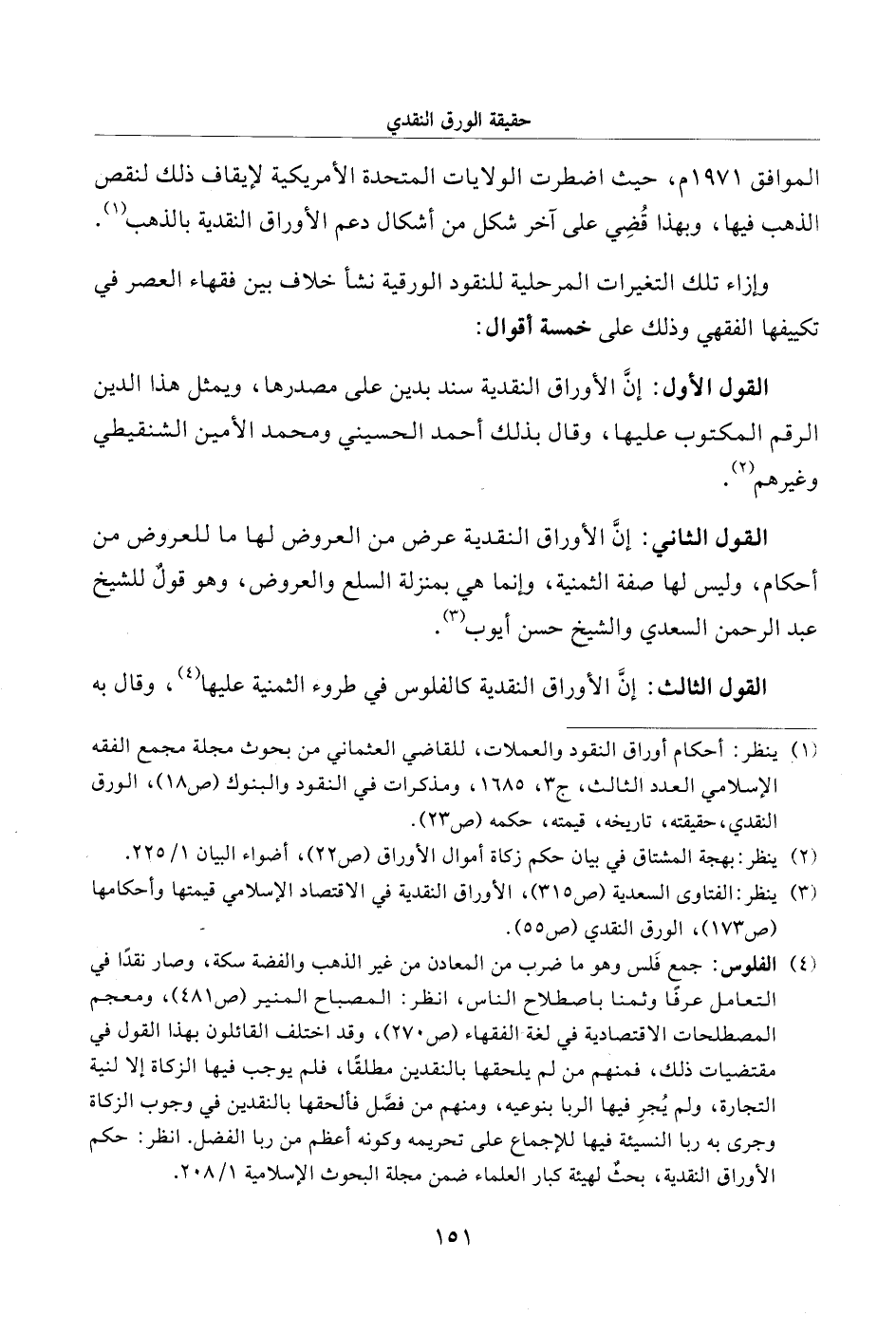 (¬1) ينظر: أحكام أوراق النقود والعملات، للقاضي العثماني من بحوث مجلة مجمع الفقه الإسلامي العدد الثالث، ج 3، 1685، ومذكرات في النقود والبنوك (ص 18)، الورق النقدي، حقيقته، تاريخه، قيمته، حكمه (ص 23).
