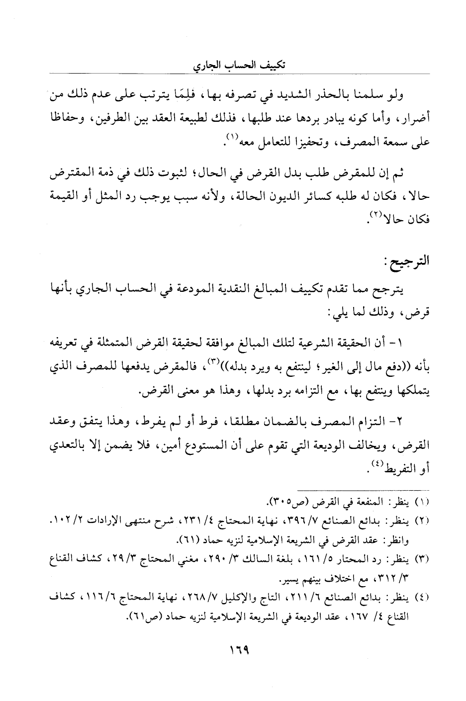 الترجيح: يترجح مما تقدم تكييف المبالغ النقدية المودعة في الحساب الجاري بأنها قرض، وذلك لما يلي: