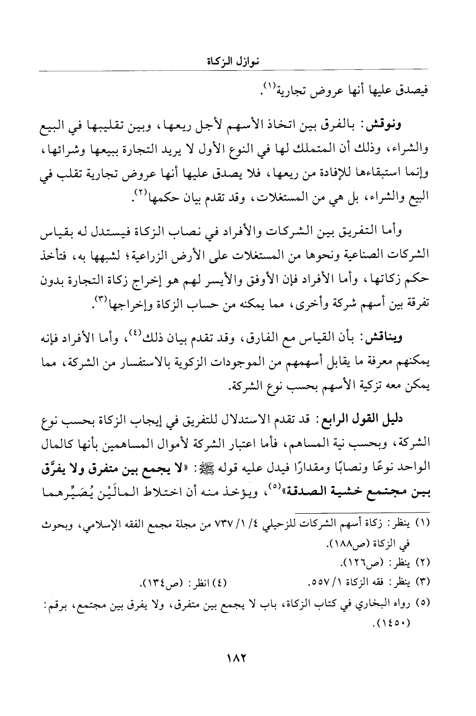 دليل القول الرابع: قد تقدم الاستدلال للتفريق في إيجاب الزكاة بحسب نوع الشركة، وبحسب نية المساهم، فأما اعتبار الشركة لأموال المساهمين بأنها كالمال الواحد نوعًا ونصابًا ومقدارًا فيدل عليه قوله - صلى الله عليه وسلم -: "لا يجمع بين متفرق ولا يفرَّق بين مجتمع خشية الصدقة" (¬5)، ويؤخذ منه أن اختلاط المالَيْن يُصَيِّرهما