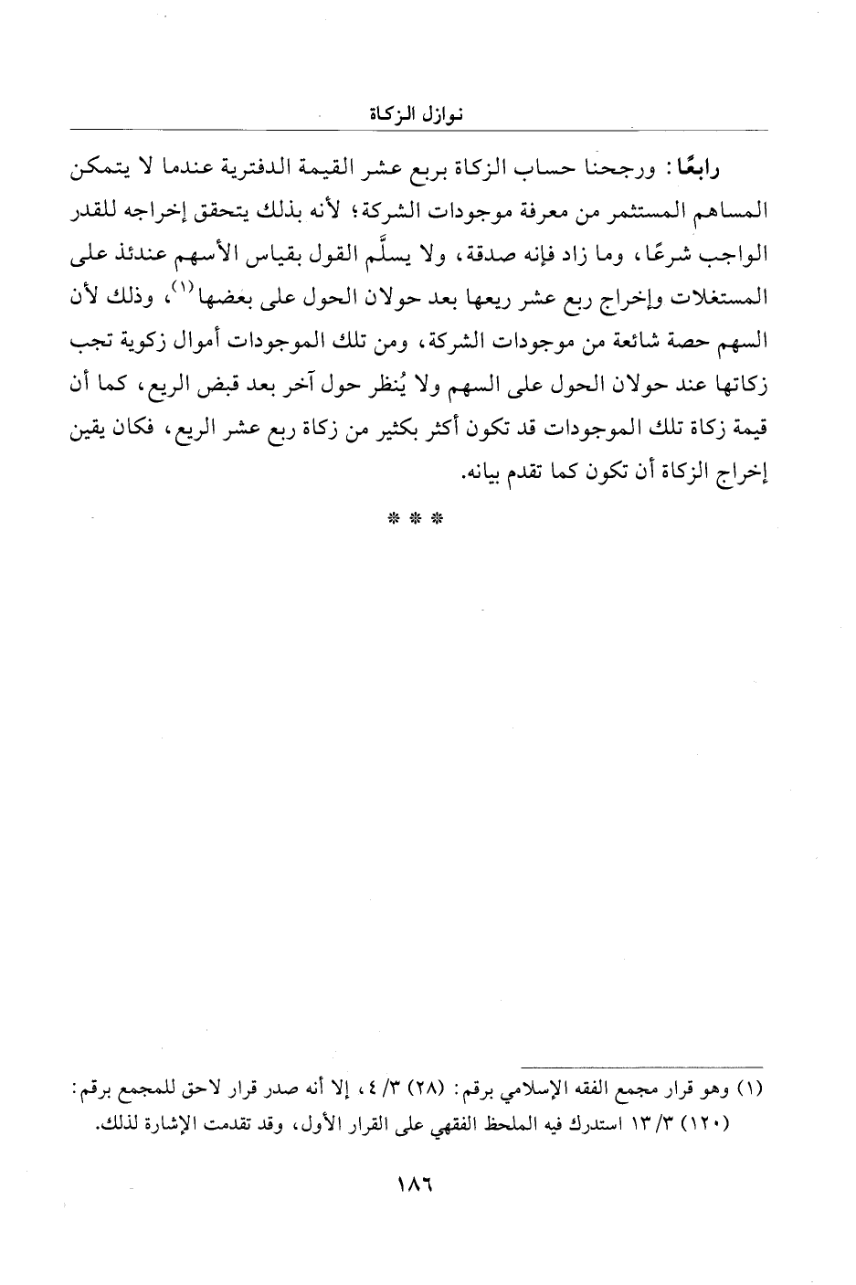 رابعًا: ورجحنا حساب الزكاة بربع عشر القيمة الدفترية عندما لا يتمكن المساهم المستثمر من معرفة موجودات الشركة، لأنه بذلك يتحقق إخراجه للقدر الواجب شرعًا، وما زاد فإنه صدقة، ولا يسلَّم القول بقياس الأسهم عندئذ على المستغلات وإخراج ربع عشر ريعها بعد حولان الحول على بعضها (¬1)، وذلك لأن السهم حصة شائعة من موجودات الشركة، ومن تلك الموجودات أموال زكوية تجب زكاتها عند حولان الحول على السهم ولا يُنظر حول آخر بعد قبض الريع، كما أن قيمة زكاة تلك الموجودات قد تكون أكثر بكثير من زكاة ربع عشر الريع، فكان يقين إخراج الزكاة أن تكون كما تقدم بيانه.
