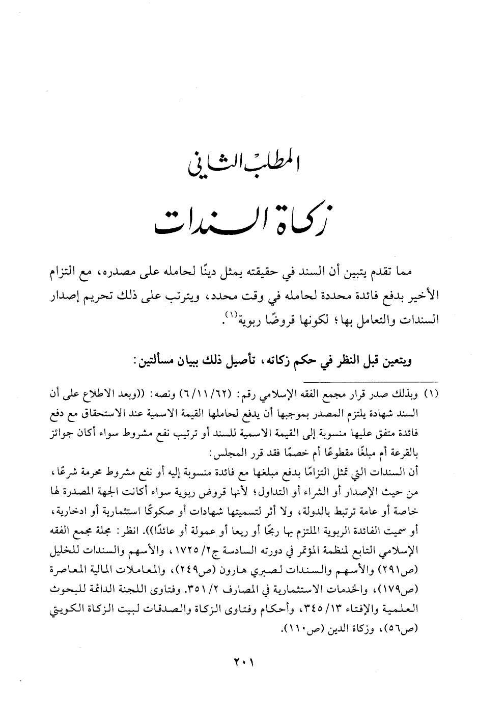 أن السندات التي تمثل التزامًا بدفع مبلغها مع فائدة منسوبة إليه أو نفع مشروط محرمة شرعًا، من حيث الإصدار أو الشراء أو التداول؛ لأنها قروض ربوية سواء أكانت الجهة المصدرة لها خاصة أو عامة ترتبط بالدولة، ولا أثر لتسميتها شهادات أو صكوكًا استثمارية أو ادخارية، أو سميت الفائدة الربوية اللتزم بها ربحًا أو ريعا أو عمولة أو عائدًا". انظر: مجلة مجمع الفقه الإسلامي التابع لمنظمة المؤتمر في دورته السادسة ج 2/ 1725، والأسهم والسندات للخليل (ص 291) والأسهم والسندات لصبري هارون (ص 249)، والمعاملات المالية المعاصرة (ص 179)، والخدمات الاستثمارية في المصارف 2/ 351. وفتاوى اللجنة الدائمة للبحوث العلمية والإفتاء 13/ 345، وأحكام وفتاوى الزكاة والصدقات لبيت الزكاة الكويتي (ص 56)، وزكاة الدين (ص 110).