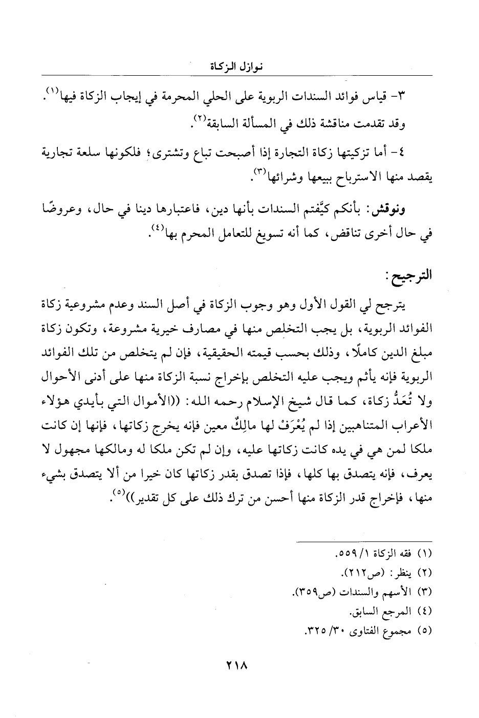 يترجح لي القول الأول وهو وجوب الزكاة في أصل السند وعدم مشروعية زكاة الفوائد الربوية، بل يجب التخلص منها في مصارف خيرية مشروعة، وتكون زكاة مبلغ الدين كاملًا، وذلك بحسب قيمته الحقيقية، فإن لم يتخلص من تلك الفوائد الربوية فإنه يأثم ويجب عليه التخلص بإخراج نسبة الزكاة منها على أدنى الأحوال ولا تُعَدُّ زكاة، كما قال شيخ الإسلام رحمه الله: "الأموال التي بأيدي هؤلاء الأعراب المتناهبين إذا لم يُعْرَفْ لها مالِكٌ معين فإنه يخرج زكاتها، فإنها إن كانت ملكا لمن هي في يده كانت زكاتها عليه، وإن لم تكن ملكا له ومالكها مجهول لا يعرف، فإنه يتصدق بها كلها، فإذا تصدق بقدر زكاتها كان خيرا من ألا يتصدق بشيء منها، فإخراج قدر الزكاة منها أحسن من ترك ذلك على كل تقدير" (¬5).