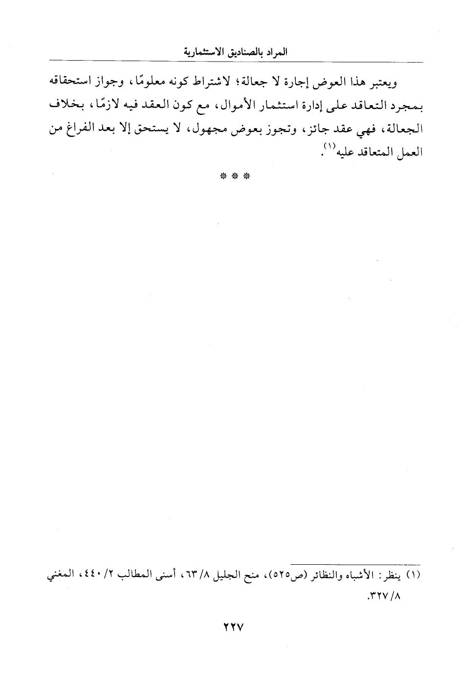 ويعتبر هذا العوض إجارة لا جعالة؛ لاشتراط كونه معلومًا، وجواز استحقاقه بمجرد التعاقد على إدارة استثمار الأموال، مع كون العقد فيه لازمًا، بخلاف الجعالة، فهي عقد جائز، وتجوز بعوض مجهول، لا يستحق إلا بعد الفراغ من العمل المتعاقد عليه (¬1).