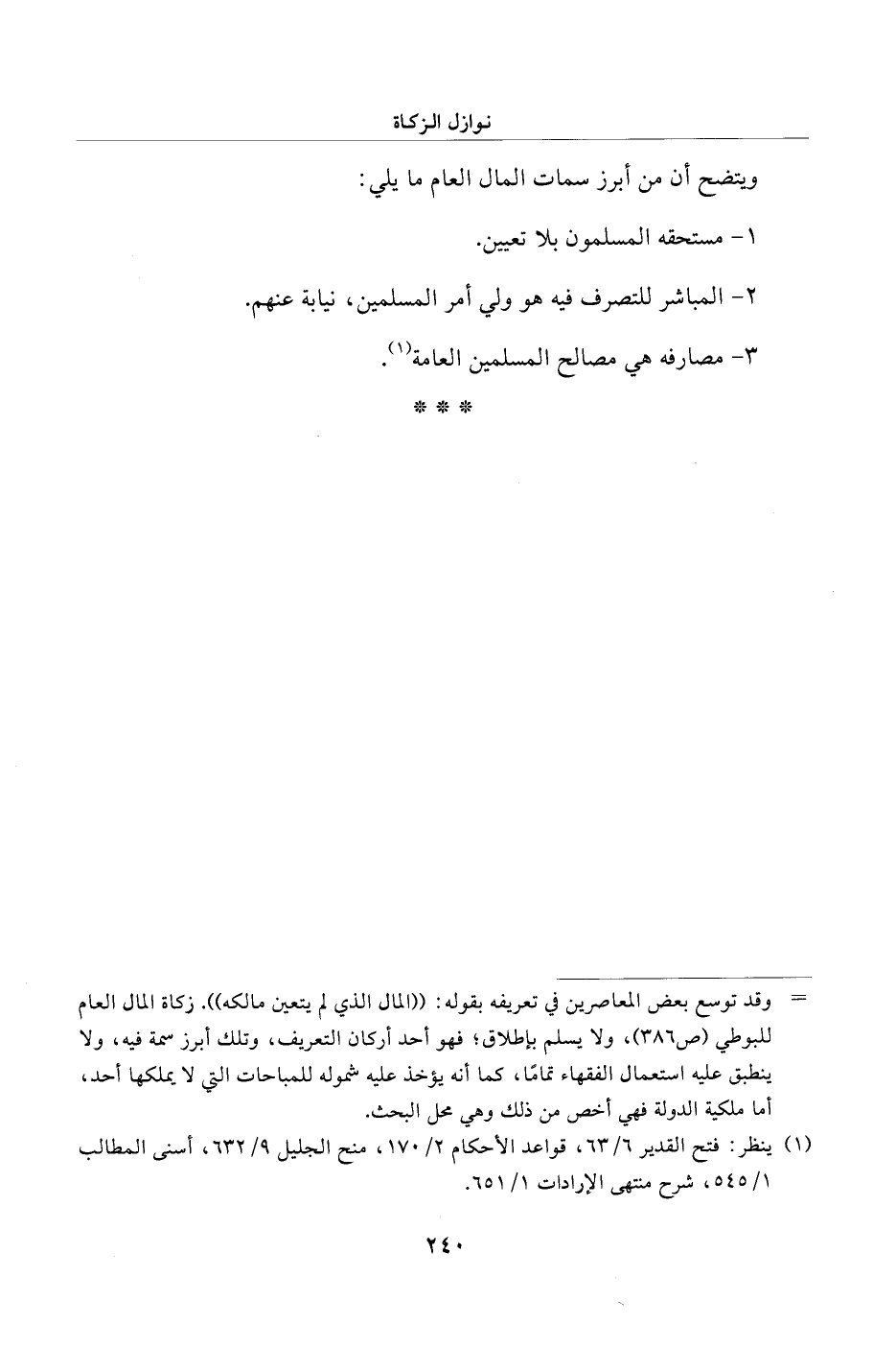 = وقد توسع بعض المعاصرين في تعريفه بقوله: "المال الذي لم يتعين مالكه". زكاة المال العام للبوطي (ص 386)، ولا يسلم بإطلاق؛ فهو أحد أركان التعريف، وتلك أبرز سمة فيه، ولا ينطبق عليه استعمال الفقهاء تمامًا، كما أنه يؤخذ عليه شهوله للمباحات التي لا يملكها أحد، أما ملكية الدولة فهي أخص من ذلك وهي محل البحث.