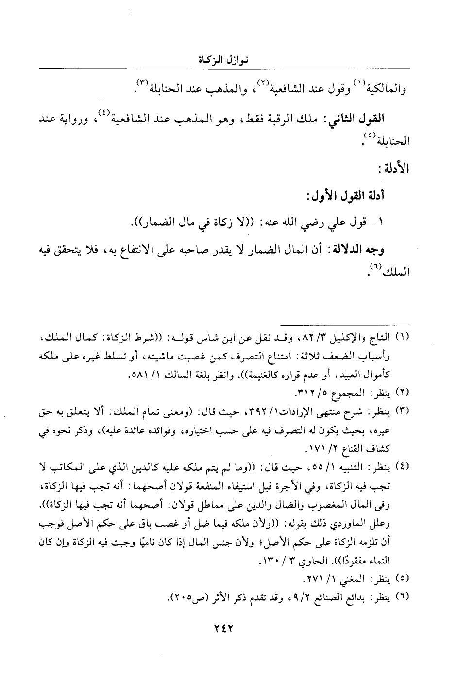 (¬1) التاج والإكليل 3/ 82، وقد نقل عن ابن شاس قوله: "شرط الزكاة: كمال الملك، وأسباب الضعف ثلاثة: امتناع التصرف كمن غصبت ماشيته، أو تسلط غيره على ملكه كأموال العبيد، أو عدم قراره كالغنيمة". وانظر بلغة السالك 1/ 581.