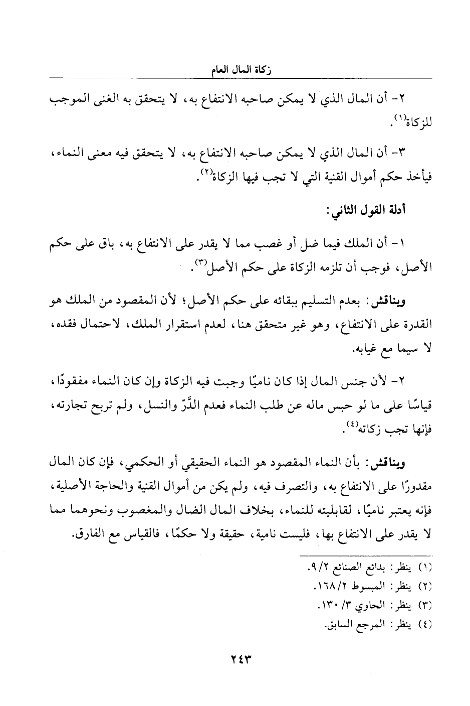 ويناقش: بأن النماء المقصود هو النماء الحقيقي أو الحكمي، فإن كان المال مقدورًا على الانتفاع به، والتصرف فيه، ولم يكن من أموال القنية والحاجة الأصلية، فإنه يعتبر ناميًا، لقابليته للنماء، بخلاف المال الضال والمغصوب ونحوهما مما لا يقدر على الانتفاع بها، فليست نامية، حقيقة ولا حكمًا، فالقياس مع الفارق.