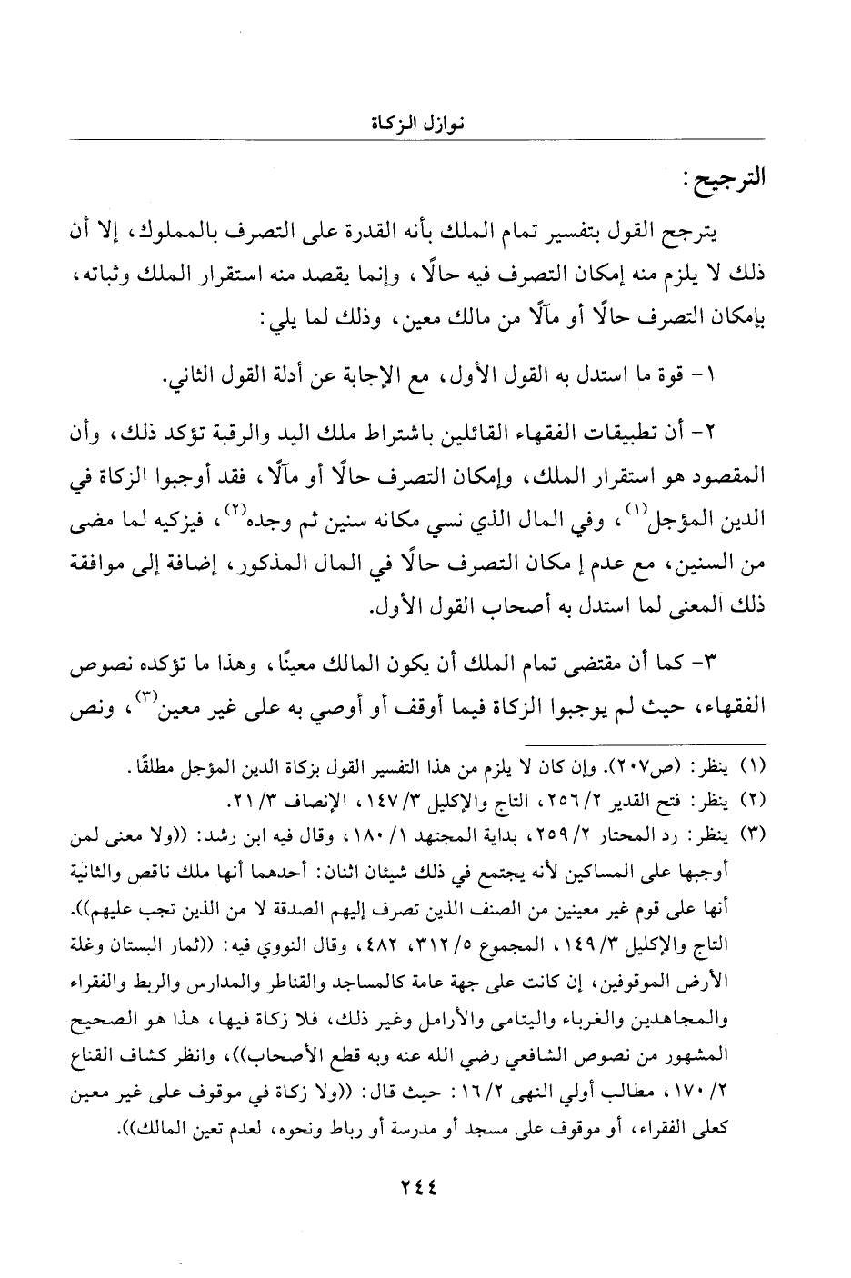 2 - أن تطبيقات الفقهاء القائلين باشتراط ملك اليد والرقبة تؤكد ذلك، وأن المقصود هو استقرار الملك، وإمكان التصرف حالًا أو مآلًا، فقد أوجبوا الزكاة في الدين المؤجل (¬1)، وفي المال الذي نسي مكانه سنين ثم وجده (¬2)، فيزكيه لما مضى من السنين، مع عدم! مكان التصرف حالًا في المال المذكور، إضافة إلى موافقة ذلك المعنى لما استدل به أصحاب القول الأول.