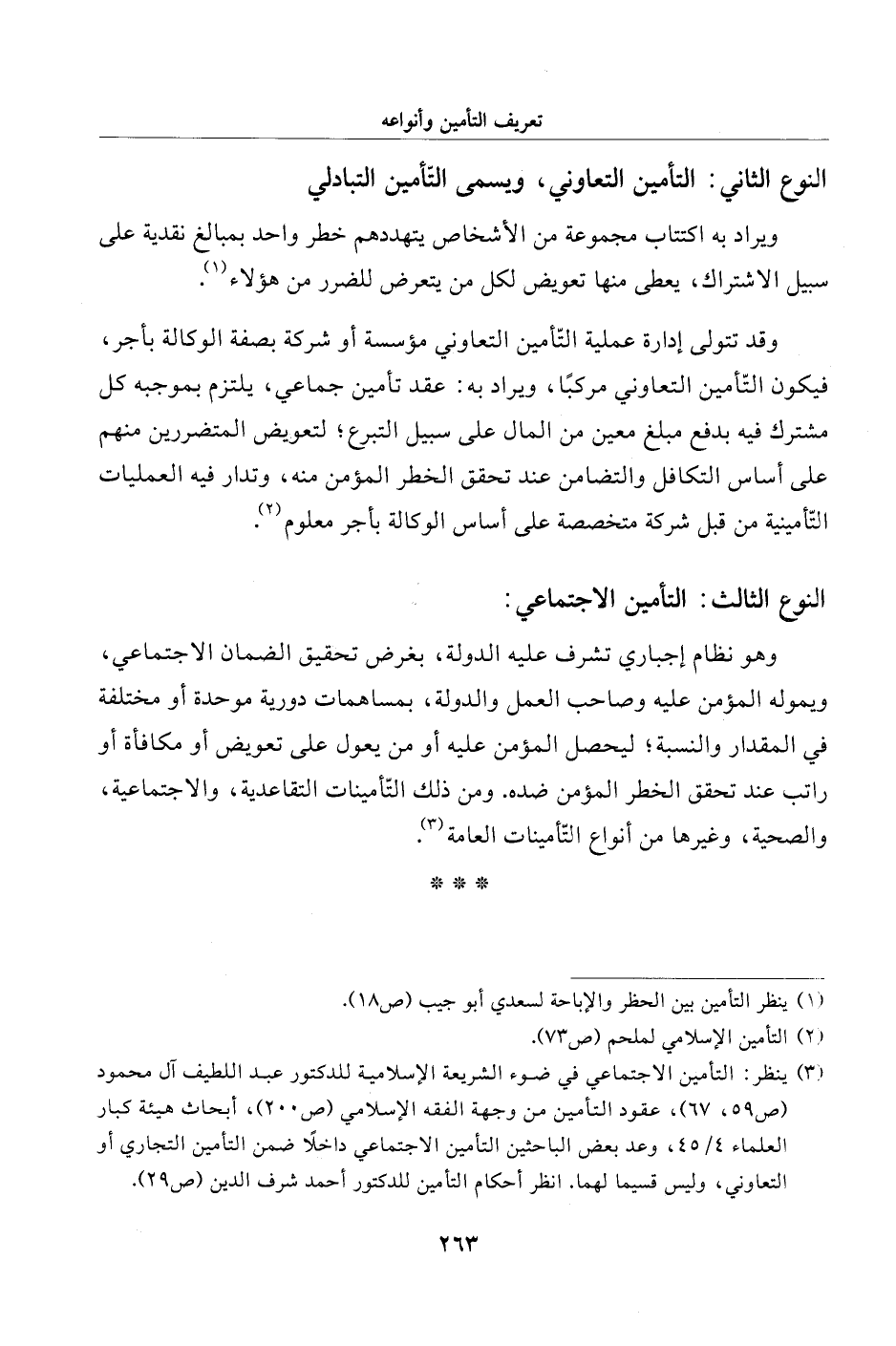 (¬3) ينظر: التأمين الاجتماعي في ضوء الشريعة الإسلامية للدكتور عبد اللطيف آل محمود (ص 59، 67)، عقود التأمين من وجهة الفقه الإسلامي (ص 200)، أبحاث هيئة كبار العلماء 4/ 45، وعد بعض الباحثين التأمين الاجتماعي داخلًا ضمن التأمين التجاري أو التعاوني، وليس قسيما لهما. انظر أحكام التأمين للدكتور أحمد شرف الدين (ص 29).
