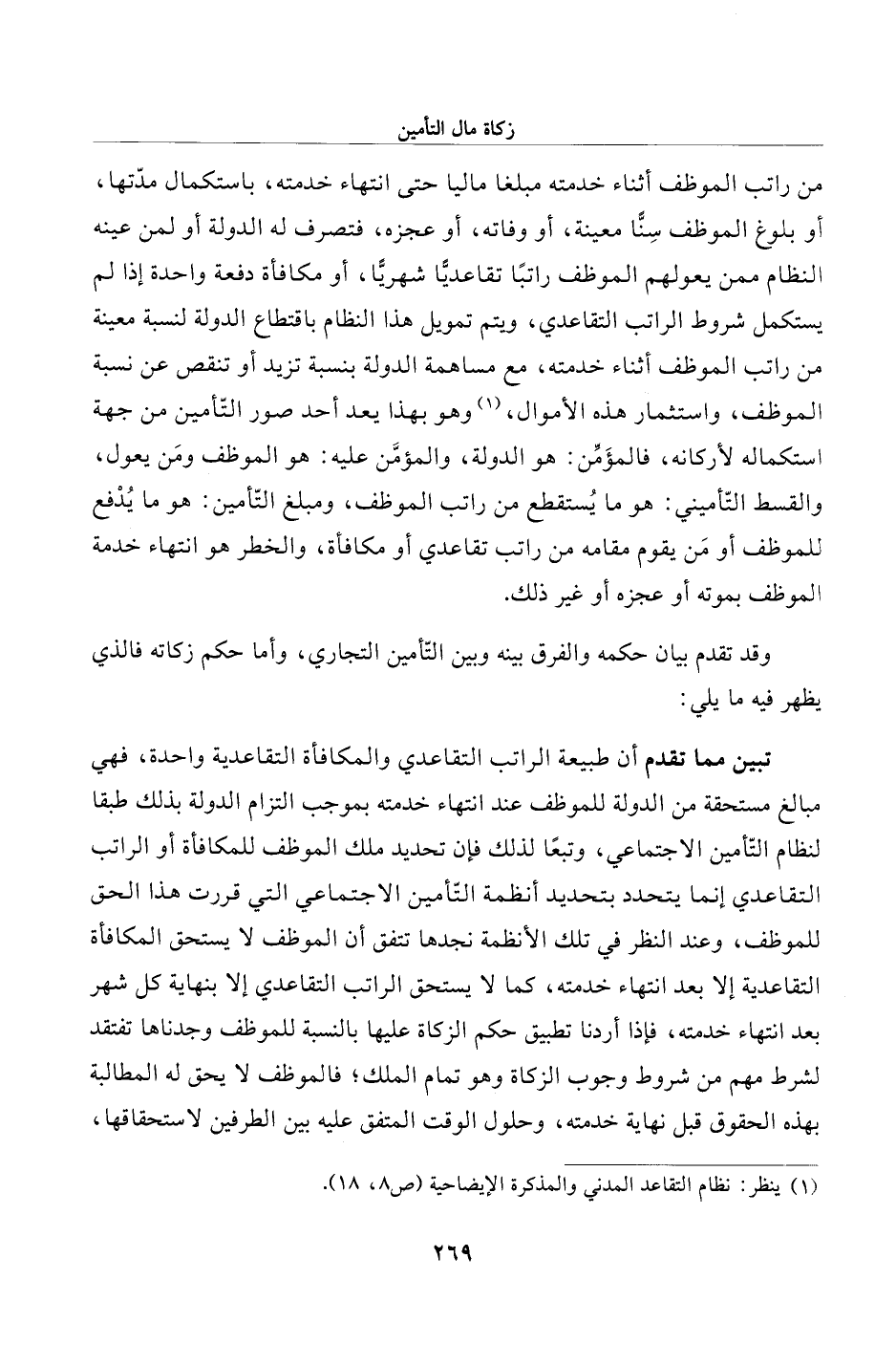 من راتب الموظف أثناء خدمته مبلغا ماليا حتى انتهاء خدمته، باستكمال مدّتها، أو بلوغ الموظف سِنًّا معينة، أو وفاته، أو عجزه، فتصرف له الدولة أو لمن عينه النظام ممن يعولهم الموظف راتبًا تقاعديا شهريًّا، أو مكافأة دفعة واحدة إذا لم يستكمل شروط الراتب التقاعدي، ويتم تمويل هذا النظام باقتطاع الدولة لنسبة معينة من راتب الموظف أثناء خدمته، مع مساهمة الدولة بنسبة تزيد أو تنقص عن نسبة الموظف، واستثمار هذه الأموال، (¬1) وهو بهذا يعد أحد صور التّأمين من جهة استكماله لأركانه، فالمؤَمِّن: هو الدولة، والمؤمَّن عليه: هو الموظف ومَن يعول، والقسط التّأميني: هو ما يُستقطع من راتب الموظف، ومبلغ التّأمين: هو ما يُدْفع للموظف أو مَن يقوم مقامه من راتب تقاعدي أو مكافأة، والخطر هو انتهاء خدمة الموظف بموته أو عجزه أو غير ذلك.