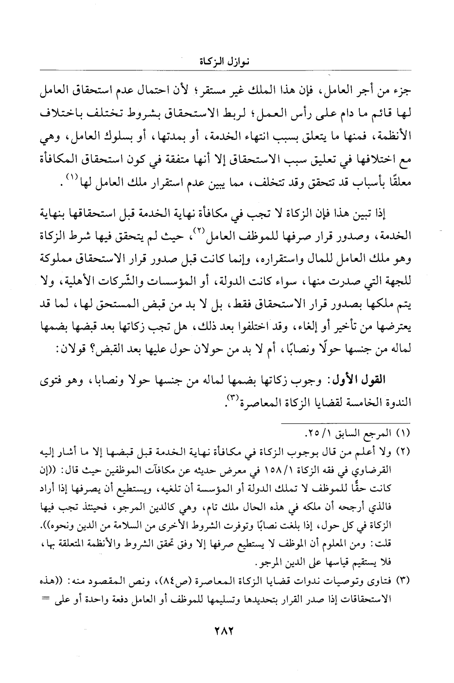 (¬2) ولا أعلم من قال بوجوب الزكاة في مكافأة نهاية الخدمة قبل قبضها إلا ما أشار إليه القرضاوي في فقه الزكاة 1/ 158 في معرض حديثه عن مكافآت الموظفين حيث قال: "إن كانت حقًّا للموظف لا تملك الدولة أو المؤسسة أن تلغيه، ويستطيع أن يصرفها إذا أراد فالذي أرجحه أن ملكه في هذه الحال ملك تام، وهي كالدين المرجو، فحينئذ تجب فيها الزكاة في كل حول، إذا بلغت نصابًا وتوفرت الشروط الأخرى من السلامة من الدين ونحوه". قلت: ومن المعلوم أن الوظف لا يستطيع صرفها إلا وفق تحقق الشروط والأنظمة المتعلقة بها، فلا يستقيم قياسها على الدين المرجو.