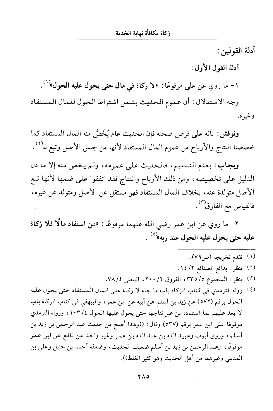 ونوقش: بأنه على فرض صحته فإن الحديث عام يُخَصُّ منه المال المستفاد كما خصصنا النتاج والأرباح من عموم المال المستفاد لأنها من جنس الأصل وتبع له (¬2).