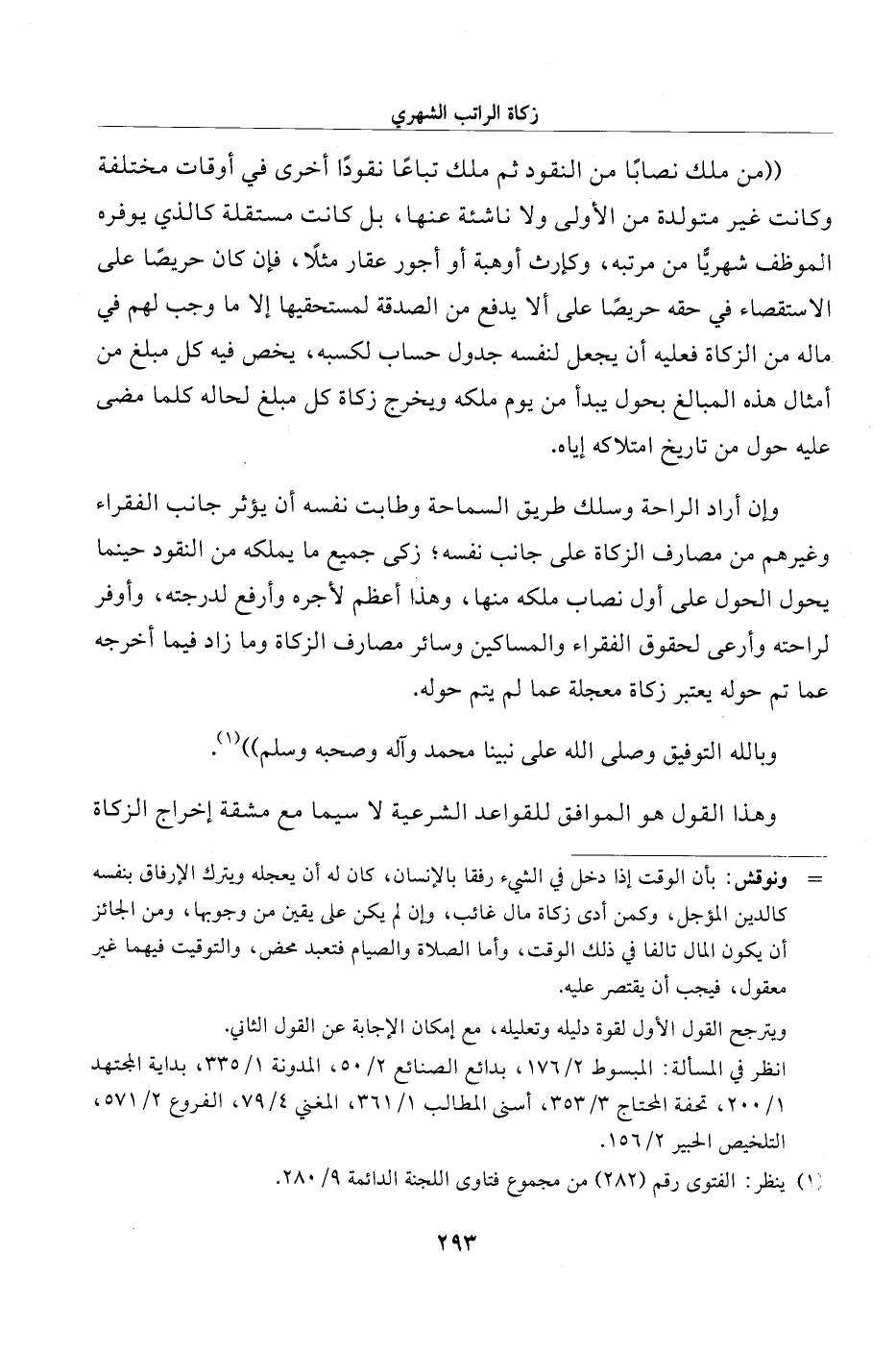 "من ملك نصابًا من النقود ثم ملك تباعًا نقودًا أخرى في أوقات مختلفة وكانت غير متولدة من الأولى ولا ناشئة عنها، بل كانت مستقلة كالذي يوفره الموظف شهريًّا من مرتبه، وكإرث أوهبة أو أجور عقار مثلًا، فإن كان حريصًا على الاستقصاء في حقه حريصًا على ألا يدفع من الصدقة لمستحقيها إلا ما وجب لهم في ماله من الزكاة فعليه أن يجعل لنفسه جدول حساب لكسبه، يخص فيه كل مبلغ من أمثال هذه المبالغ بحول يبدأ من يوم ملكه ويخرج زكاة كل مبلغ لحاله كلما مضى عليه حول من تاريخ امتلاكه إياه.