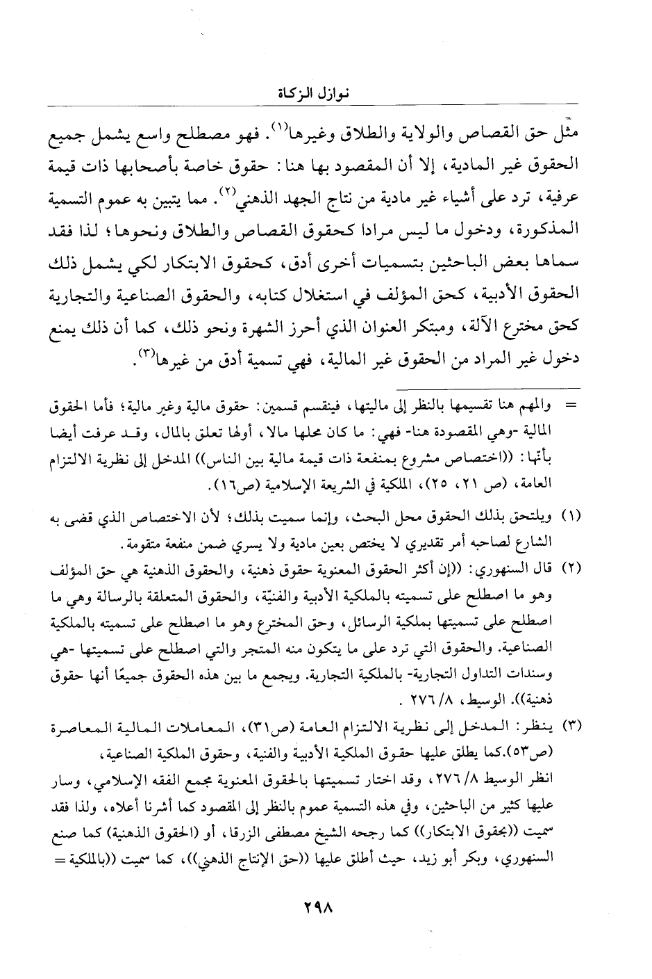 (¬2) قال السنهوري: "إن أكثر الحقوق المعنوية حقوق ذهنية، والحقوق الذهنية هي حق المؤلف وهو ما اصطلح على تسميته بالملكية الأدبية والفنيّة، والحقوق المتعلقة بالرسالة وهي ما اصطلح على تسميتها بملكية الرسائل، وحق المخترع وهو ما اصطلح على تسميته بالملكية الصناعية. والحقوق التي ترد على ما يتكون منه المتجر والتي اصطلح على تسميتها -هي وسندات التداول التجارية - بالملكية التجارية. ويجمع ما بين هذه الحقوف جميعًا أنها حقوق ذهنية". الوسيط، 8/ 276.