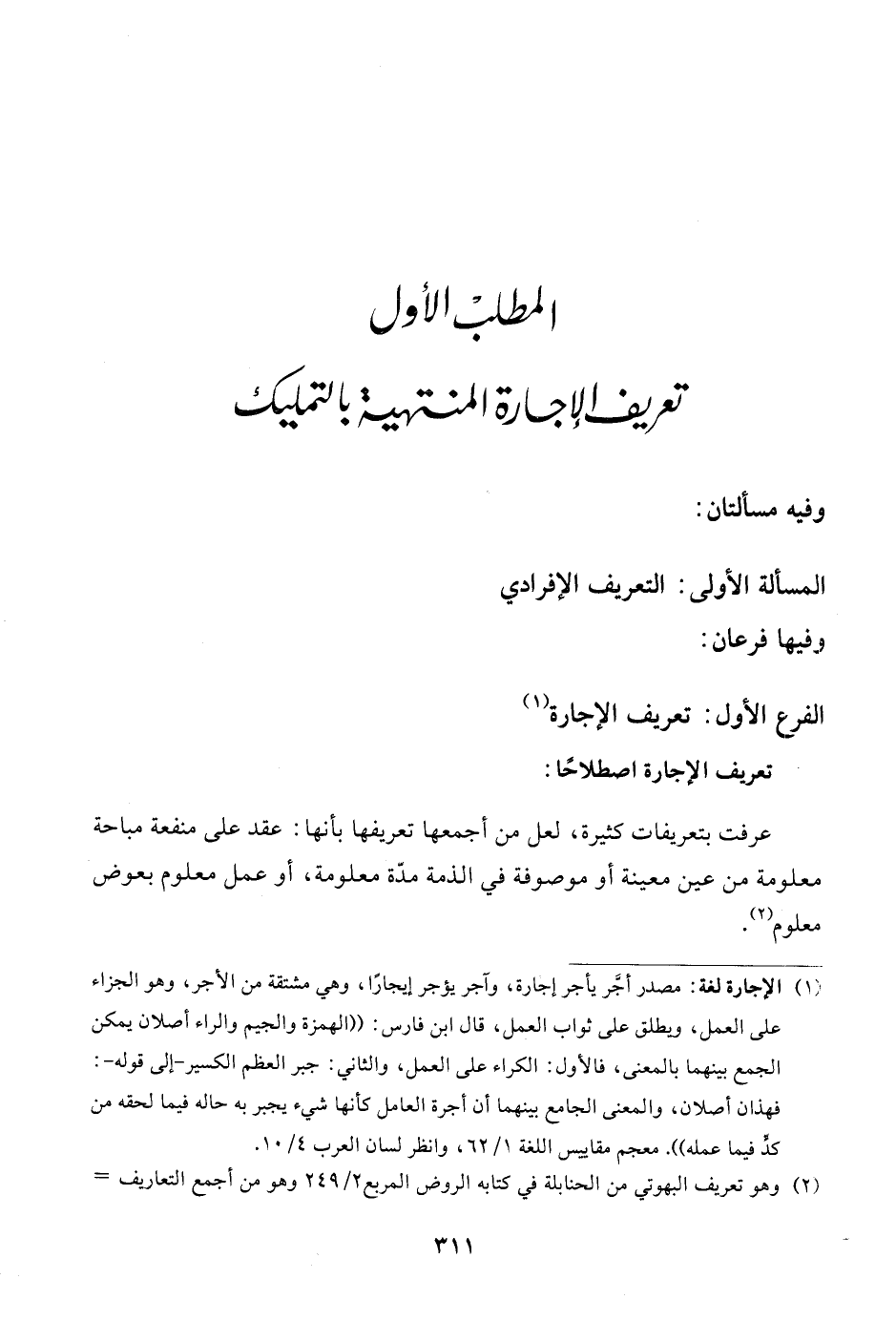 (¬1) الإجارة لغة: مصدر أجَّر يأجر إجارة، وآجر يؤجر إيجارًا، وهي مشتقة من الأجر، وهو الجزاء على العمل، ويطلق على ثواب العمل، قال ابن فارس: "الهمزة والجيم والراء أصلان يمكن الجمع بينهما بالمعنى، فالأول: الكراء على العمل، والثاني: جبر العظم الكسير -إلى قوله-: فهذان أصلان، والمعنى الجامع بينهما أن أجرة العامل كأنها شيء يجبر به حاله فيما لحقه من كدٍّ فيما عمله". معجم مقاييس اللغة 1/ 62، وانظر لسان العرب 4/ 10.