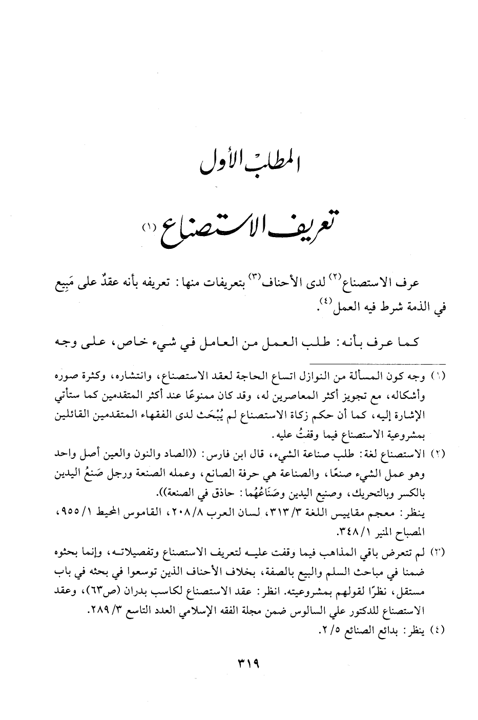 (¬3) لم تتعرض باقي المذاهب فيما وقفت عليه لتعريف الاستصناع وتفصيلاته، وإنما بحثوه ضمنا في مباحث السلم والبيع بالصفة، بخلاف الأحناف الذين توسعوا في بحثه في باب مستقل، نظرًا لقولهم بمشروعيته. انظر: عقد الاستصناع لكاسب بدران (ص 63)، وعقد الاستصناع للدكتور علي السالوس ضمن مجلة الفقه الإسلامي العدد التاسع 3/ 289.