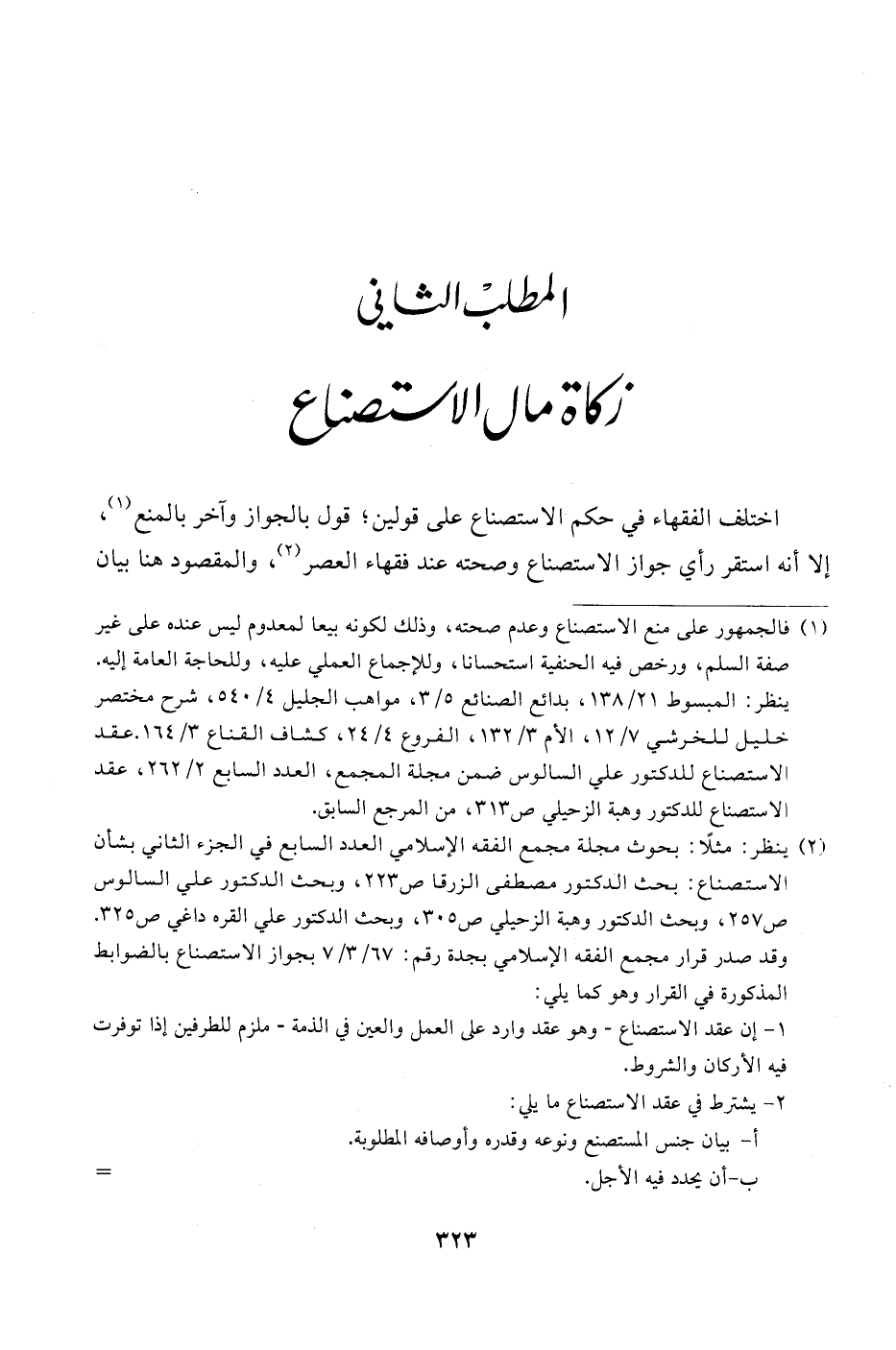 (¬2) ينظر: مثلًا: بحوث مجلة مجمع الفقه الإسلامي العدد السابع في الجزء الثاني بشأن الاستصناع: بحث الدكتور مصطفى الزرقا ص 223، وبحث الدكتور علي السالوس ص 257، وبحث الدكتور وهبة الزحيلي ص 305، وبحث الدكتور علي القره داغي ص 325. وقد صدر قرار مجمع الفقه الإسلامي بجدة رقم: 67/ 3 / 7 بجواز الاستصناع بالضوابط المذكورة في القرار وهو كما يلي: