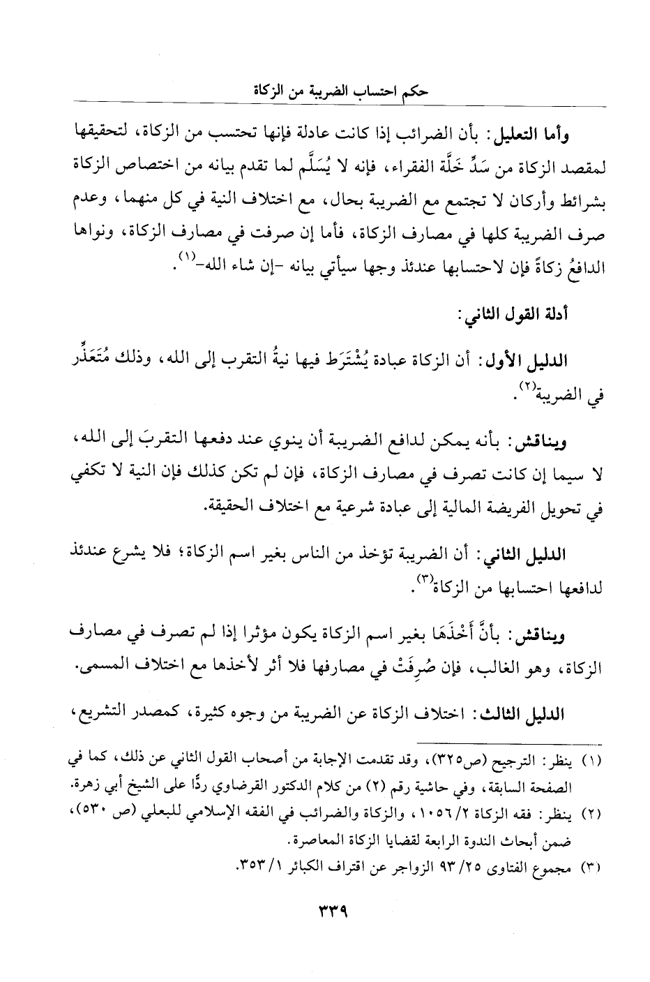 وأما التعليل: بأن الضرائب إذا كانت عادلة فإنها تحتسب من الزكاة، لتحقيقها لمقصد الزكاة من سَدِّ خَلَّة الفقراء، فإنه لا يُسَلَّم لما تقدم بيانه من اختصاص الزكاة بشرائط وأركان لا تجتمع مع الضريبة بحال، مع اختلاف النية في كل منهما، وعدم صرف الضريبة كلها في مصارف الزكاة، فأما إن صرفت في مصارف الزكاة، ونواها الدافعُ زكاةً فإن لاحتسابها عندئذ وجها سيأتي بيانه -إن شاء الله- (¬1).