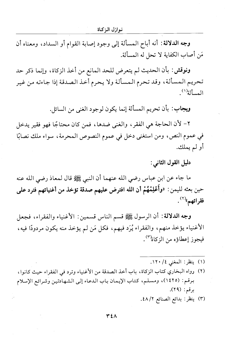 2 - لأن الحاجة هي الفقر، والغنى ضدها، فمن كان محتاجًا فهو فقير يدخل في عموم النص، ومن استغنى دخل في عموم النصوص المحرمة، سواء ملك نصابًا أو لم يملك.