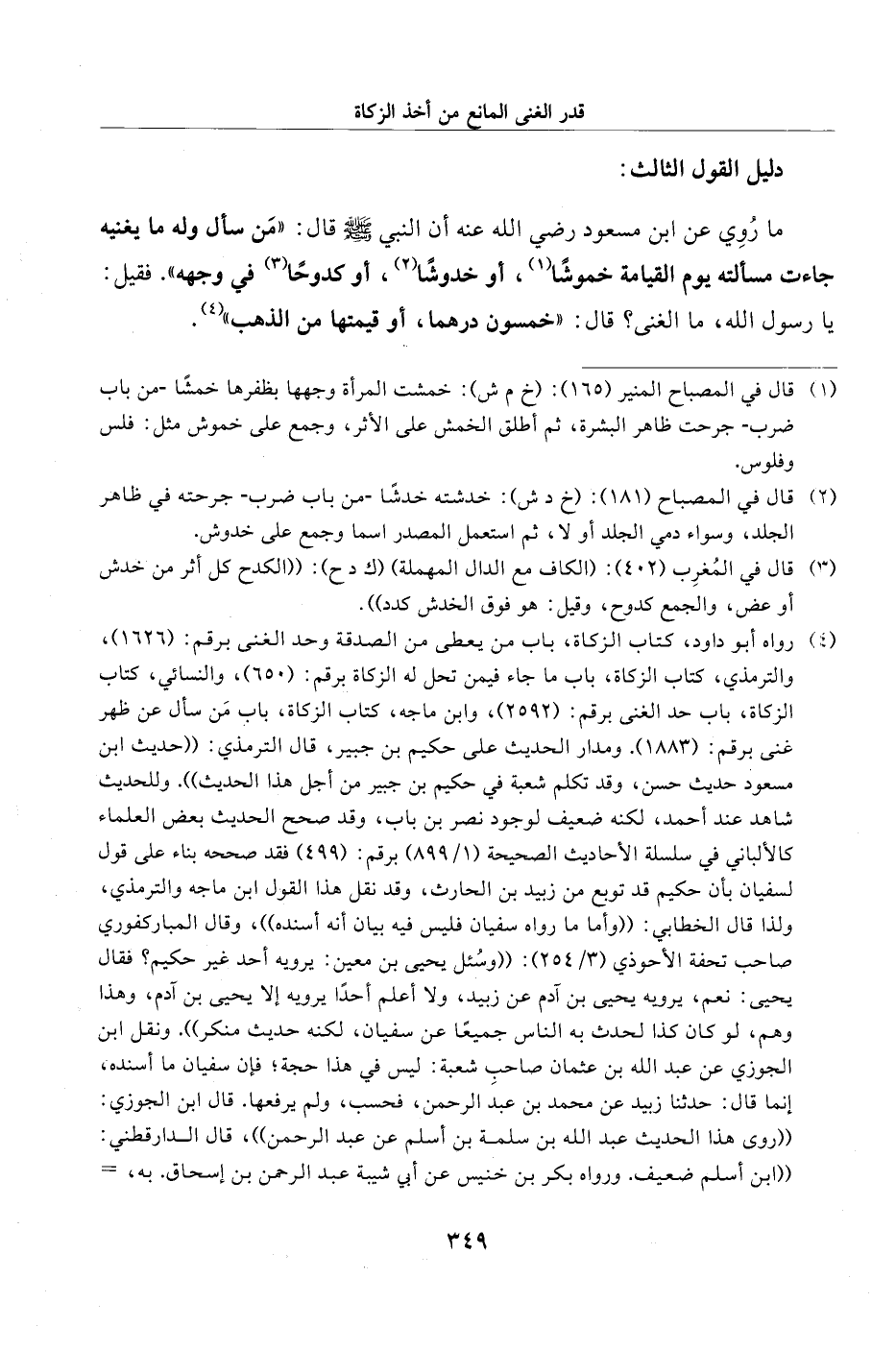 (¬4) رواه أبو داود، كتاب الزكاة، باب من يعطى من الصدقة وحد الغنى برقم: (1626)، والترمذي، كتاب الزكاة، باب ما جاء فيمن تحل له الزكاة برقم: (650)، والنسائي، كتاب الزكاة، باب حد الغنى برقم: (2592)، وابن ماجه، كتاب الزكاة، باب مَن سأل عن ظهر غنى برقم: (1883). ومدار الحديث على حكيم بن جبير، قال الترمذي: "حديث ابن مسعود حديث حسن، وقد تكلم شعبة في حكيم بن جبير من أجل هذا الحديث". وللحديث شاهد عند أحمد، لكنه ضعيف لوجود نصر بن باب، وقد صحح الحديث بعض العلماء كالألباني في سلسلة الأحاديث الصحيحة (1/ 899) برقم: (499) فقد صححه بناء على قول لسفيان بأن حكيم قد توبع من زبيد بن الحارث، وقد نقل هذا القول ابن ماجه والترمذي، ولذا قال الخطابي: "وأما ما رواه سفيان فليس فيه بيان أنه أسنده"، وقال المباركفوري صاحب تحفة الأحوذي (3/ 254): "وسُئل يحيى بن معين: يرويه أحد غير حكيم؟ فقال يحيى: نعم، يرويه يحيى بن آدم عن زبيد، ولا أعلم أحدًا يرويه إلا يحيى بن آدم، وهذا وهم، لو كان كذا لحدث به الناس جميعًا عن سفيان، لكنه حديث منكر". ونقل ابن الجوزي عن عبد الله بن عثمان صاحبِ شعبة: ليس في هذا حجة؛ فإن سفيان ما أسنده، إنما قال: حدثنا زبيد عن محمد بن عبد الرحمن، فحسب، ولم يرفعها. قال ابن الجوزي: "روى هذا الحديث عبد الله بن سلمة بن أسلم عن عبد الرحمن"، قال الدارقطني: "ابن أسلم ضعيف. ورواه بكر بن خنيس عن أبي شيبة عبد الرحمن بن إسحاق. به، =