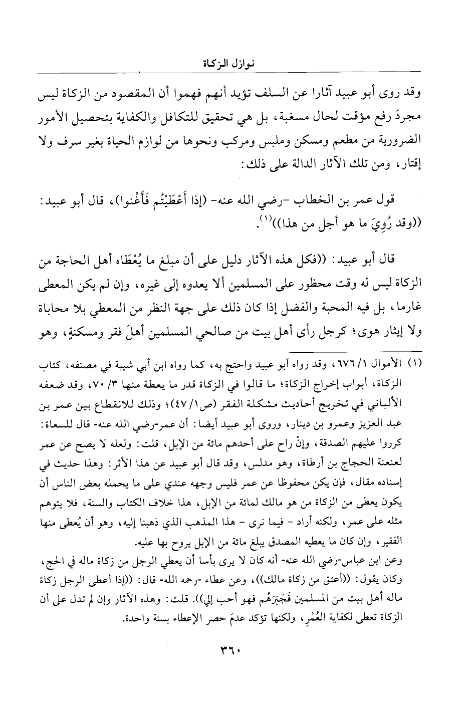 وقد روى أبو عبيد آثارا عن السلف تؤيد أنهم فهموا أن المقصود من الزكاة ليس مجردَ رفع مؤقت لحال مسغبة، بل هي تحقيق للتكافل والكفاية بتحصيل الأمور الضرورية من مطعم ومسكن وملبس ومركب ونحوها من لوازم الحياة بغير سرف ولا إقتار، ومن تلك الآثار الدالة على ذلك: