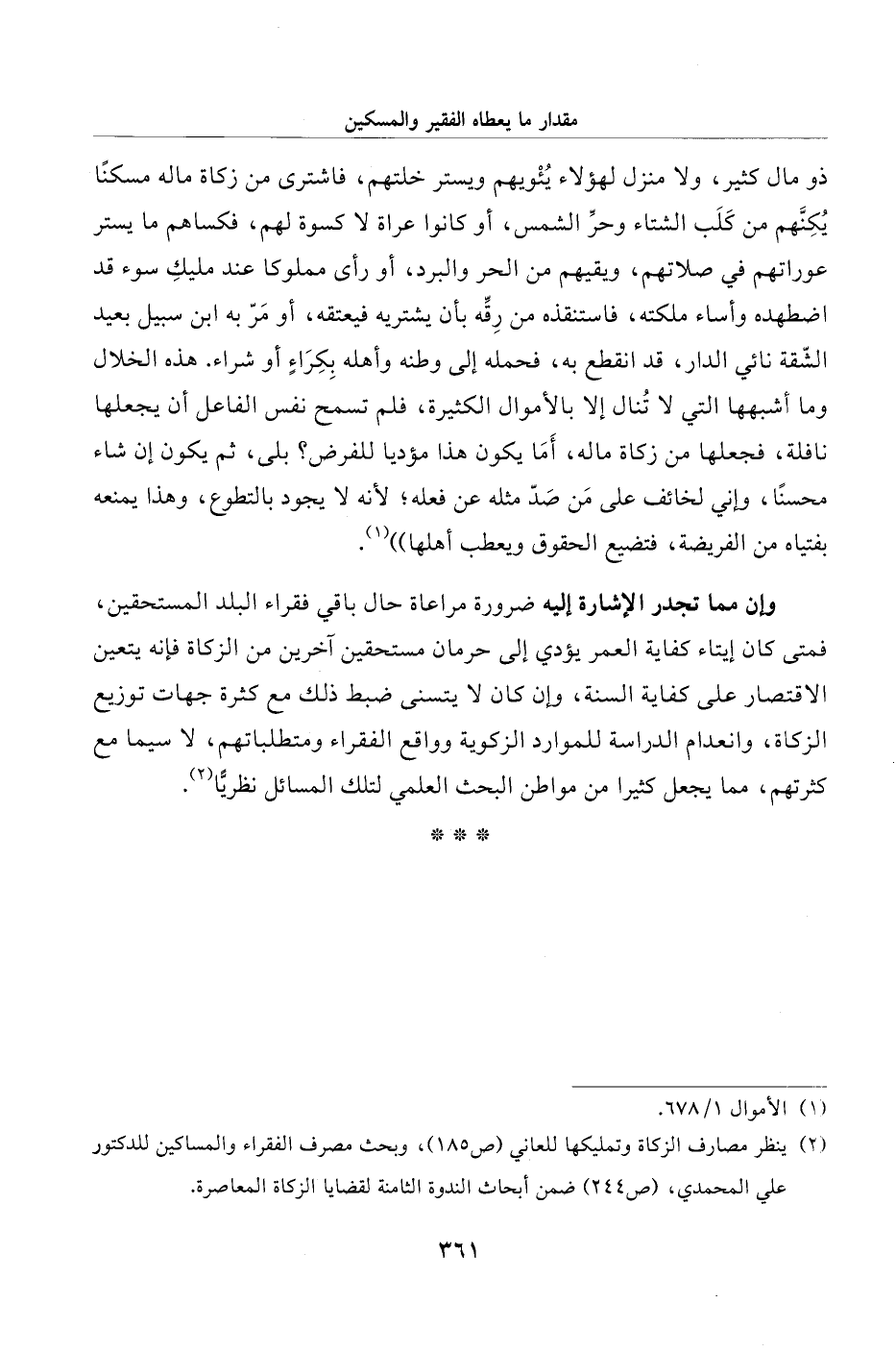 (¬2) ينظر مصارف الزكاة وتمليكها للعاني (ص 185)، وبحث مصرف الفقراء والمساكين للدكتور علي المحمدي، (ص 244) ضمن أبحاث الندوة الثامنة لقضايا الزكاة المعاصرة.