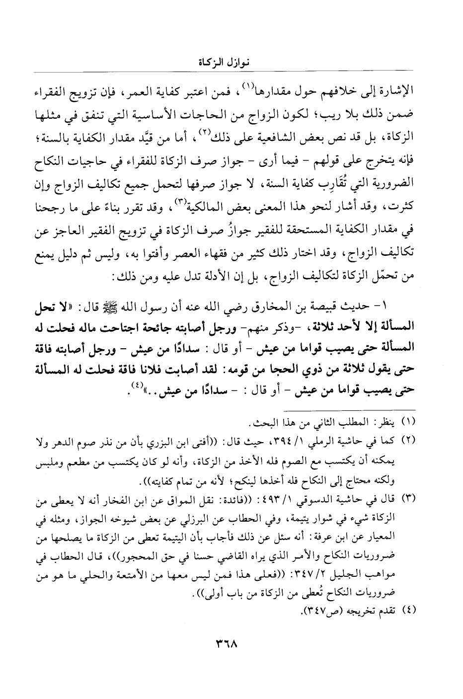 1 - حديث قبيصة بن المخارق رضي الله عنه أن رسول الله - صلى الله عليه وسلم - قال: "لا تحل المسألة إلا لأحد ثلاثة، - وذكر منهم - ورجل أصابته جائحة اجتاحت ماله فحلت له المسألة حتى يصيب قواما من عيش - أو قال: سدادًا من عيش - ورجل أصابته فاقة حتى يقول ثلاثة من ذوي الحجا من قومه: لقد أصابت فلانا فاقة فحلت له المسألة حتى يصيب قواما من عيش - أو قال: - سدادًا من عيش. . " (¬4).