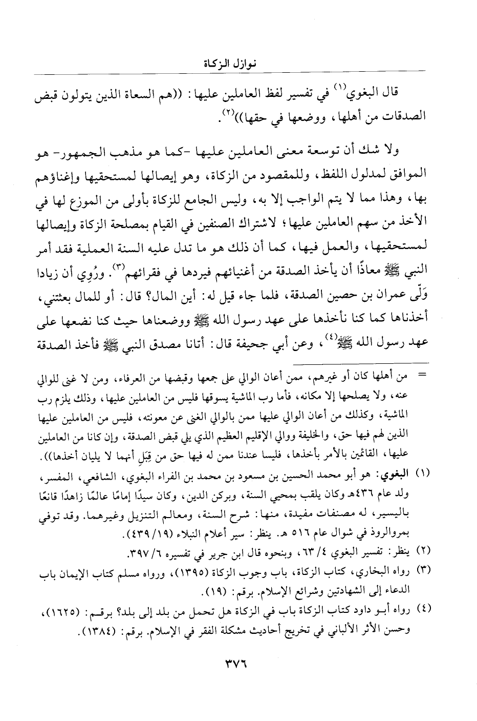 ولا شك أن توسعة معنى العاملين عليها - كما هو مذهب الجمهور - هو الموافق لمدلول اللفظ، وللمقصود من الزكاة، وهو إيصالها لمستحقيها وإغناؤهم بها، وهذا مما لا يتم الواجب إلا به، وليس الجامع للزكاة بأولى من الموزع لها في الأخذ من سهم العاملين عليها؛ لاشتراك المصنفين في القيام بمصلحة الزكاة وإيصالها لمستحقيها، والعمل فيها، كما أن ذلك هو ما تدل عليه السنة العملية فقد أمر النبي - صلى الله عليه وسلم - معاذًا أن يأخذ الصدقة من أغنيائهم فيردها في فقرائهم (¬3).