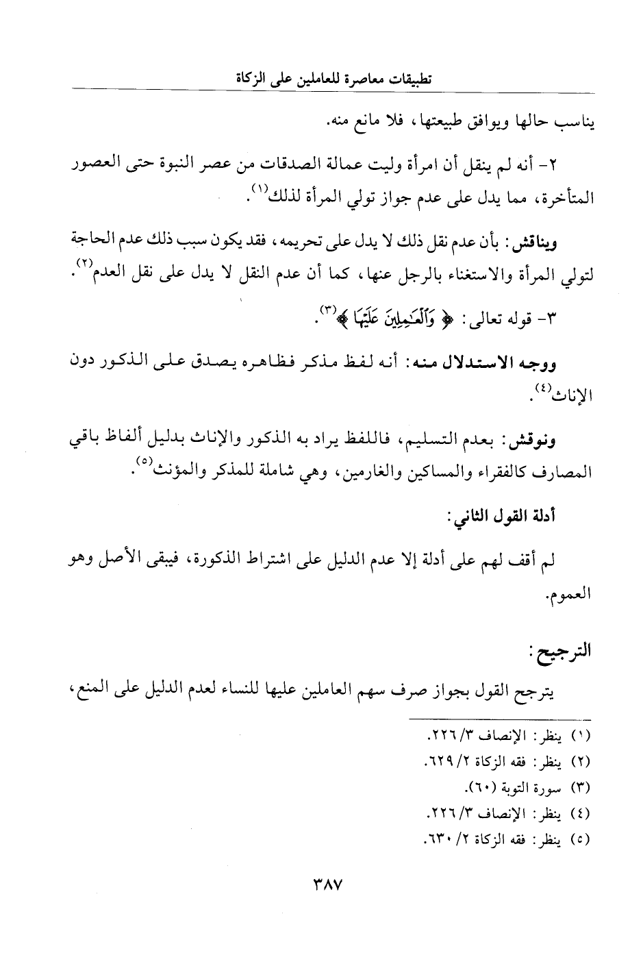 ونوقش: بعدم التسليم، فاللفظ يراد به الذكور والإناث بدليل ألفاظ باقي المصارف كالفقراء والمساكين والغارمين، وهي شاملة للمذكر والمؤنث (¬5).