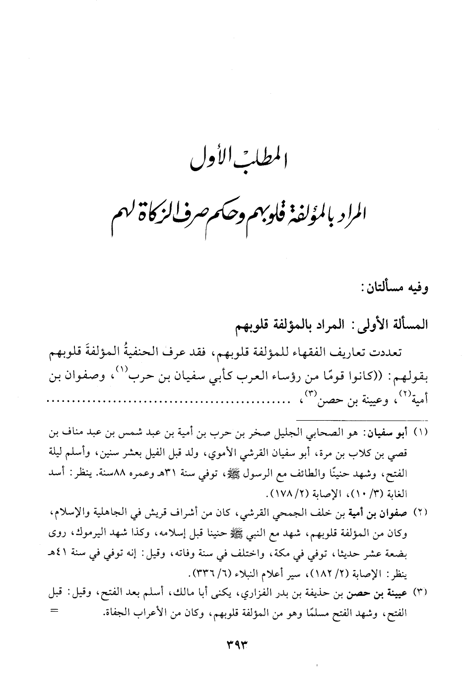 المسألة الأولى: المراد بالمؤلفة قلوبهم تعددت تعاريف الفقهاء للمؤلفة قلوبهم، فقد عرف الحنفيةُ المؤلفةَ قلوبهم بقولهم: "كانوا قومًا من رؤساء العرب كأبي سفيان بن حرب (¬1)، وصفوان بن أمية (¬2)، وعيينة بن حصن (¬3)،. . . . . . . . . . . . . . . .