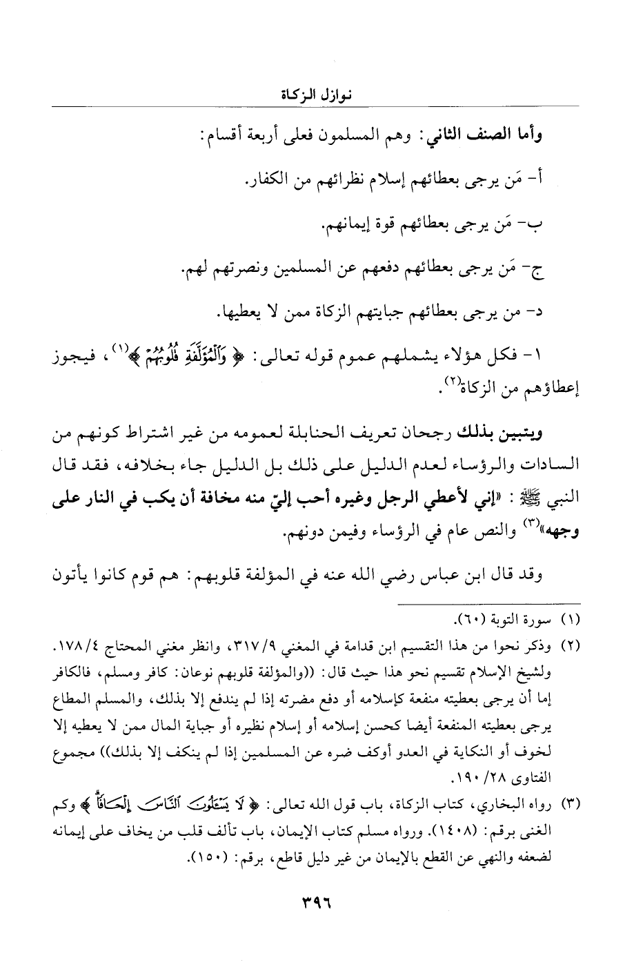 (¬2) وذكر نحوا من هذا التقسيم ابن قدامة في المغني 9/ 317، وانظر مغني المحتاج 4/ 178. ولشيخ الإسلام تقسيم نحو هذا حيث قال: "والمؤلفة قلوبهم نوعان: كافر ومسلم، فالكافر إما أن يرجى بعطيته منفعة كإسلامه أو دفع مضرته إذا لم يندفع إلا بذلك، والمسلم المطاع يرجى بعطيته المنفعة أيضا كحسن إسلامه أو إسلام نظيره أو جباية المال ممن لا يعطيه إلا لخوف أو النكاية في العدو أو كف ضره عن المسلمين إذا لم ينكف إلا بذلك" مجموع الفتاوى 28/ 190.
