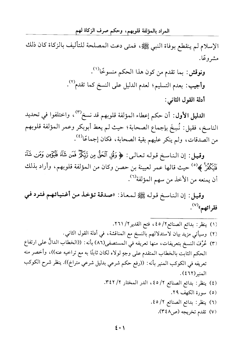 الدليل الأول: أن حكم إعطاء المؤلفة قلوبهم قد نسخ (¬3)، واختلفوا في تحديد الناسخ، فقيل: نُسِخَ بإجماع الصحابة، حيث لم يعط أبو بكر وعمر المؤلفة قلوبهم من الصدقات، ولم ينكر عليهم بقية الصحابة، فكان إجماعًا (¬4).
