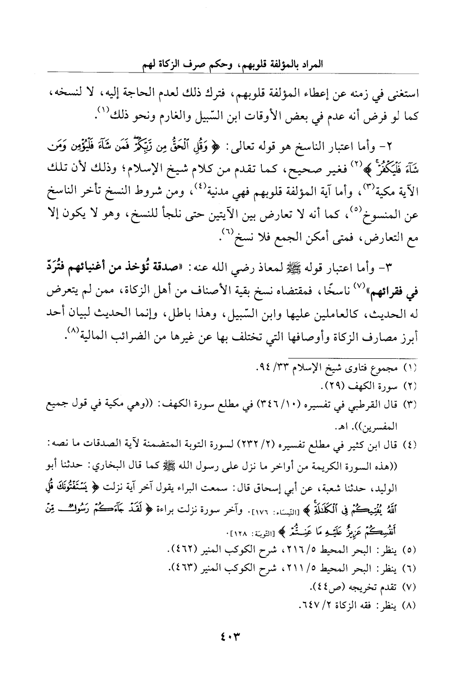 2 - وأما اعتبار الناسخ هو قوله تعالى: {وَقُلِ الْحَقُّ مِنْ رَبِّكُمْ فَمَنْ شَاءَ فَلْيُؤْمِنْ وَمَنْ شَاءَ فَلْيَكْفُرْ} [الكهف: 29] (¬2) فغير صحيح، كما تقدم من كلام شيخ الإسلام؛ وذلك لأن تلك الآية مكية (¬3)، وأما آية المؤلفة قلوبهم فهي مدنية (¬4)، ومن شروط النسخ تأخر الناسخ عن المنسوخ (¬5)، كما أنه لا تعارض بين الآيتين حتى نلجأ للنسخ، وهو لا يكون إلا مع التعارض، فمتى أمكن الجمع فلا نسخ (¬6).