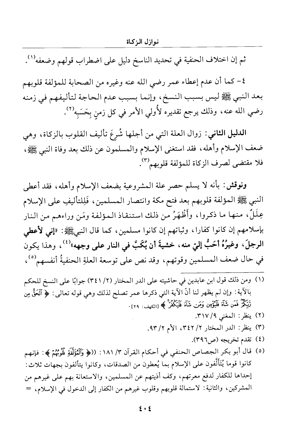 ونوقش: بأنه لا يسلم حصر علة المشروعية بضعف الإسلام وأهله، فقد أعطى النبي - صلى الله عليه وسلم - المؤلفة قلوبهم بعد فتح مكة وانتصار المسلمين، فَلِلتأليفِ على الإسلام عِلَل، منها ما ذكروا، وأَظْهَرُ من ذلك استنقاذ المؤلفة ومَن وراءهم من النار بإسلامهم إن كانوا كفارا، وثباتهم إن كانوا مسلمين، كما قال النبي - صلى الله عليه وسلم -: "إني لأعطي الرجلَ، وغيرُهُ أحَبُّ إليّ منه، خشيةَ أن يُكَبَّ في النار على وجهه " (¬4)، وهذا يكون في حال ضعف المسلمين وقوتهم، وقد نص على توسعة العلةِ الحنفيةُ أنفسهم (¬5)،