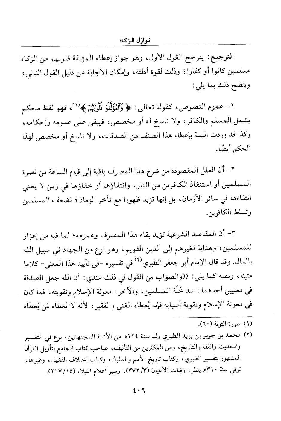 3 - أن المقاصد الشرعية تؤيد بقاء هذا المصرف وعمومه؛ لما فيه من إعزاز للمسلمين، وهداية لغيرهم إلى الدين القويم، وهو نوع من الجهاد في سبيل الله بالمال. وقد قال الإمام أبو جعفر الطبري (¬2) في تفسيره - في تأييد هذا المعنى - كلاما متينا، ونصه كما يلي: "والصواب من القول في ذلك عندي: أن الله جعل الصدقة في معنيين أحدهما: سد خَلّة المسلمين، والآخر: معونة الإسلام وتقويته، فما كان في معونة الإسلام وتقوية أسبابه فإنه يُعطاه الغني والفقير؛ لأنه لا يُعطاه مَن يُعطاه
