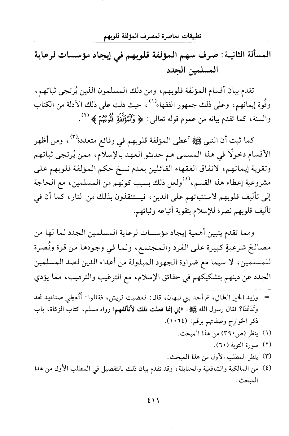 تقدم بيان أقسام المؤلفة قلوبهم، ومن ذلك المسلمون الذين يُرتجى ثباتهم، وقُوة إيمانهم، وعلى ذلك جمهور الفقهاء (¬1)، حيث دلت على ذلك الأدلة من الكتاب والسنة، كما تقدم بيانه من عموم قوله تعالى: {وَاَلْمُؤَلَفَةِ قُلُوبُهُمْ} (¬2).