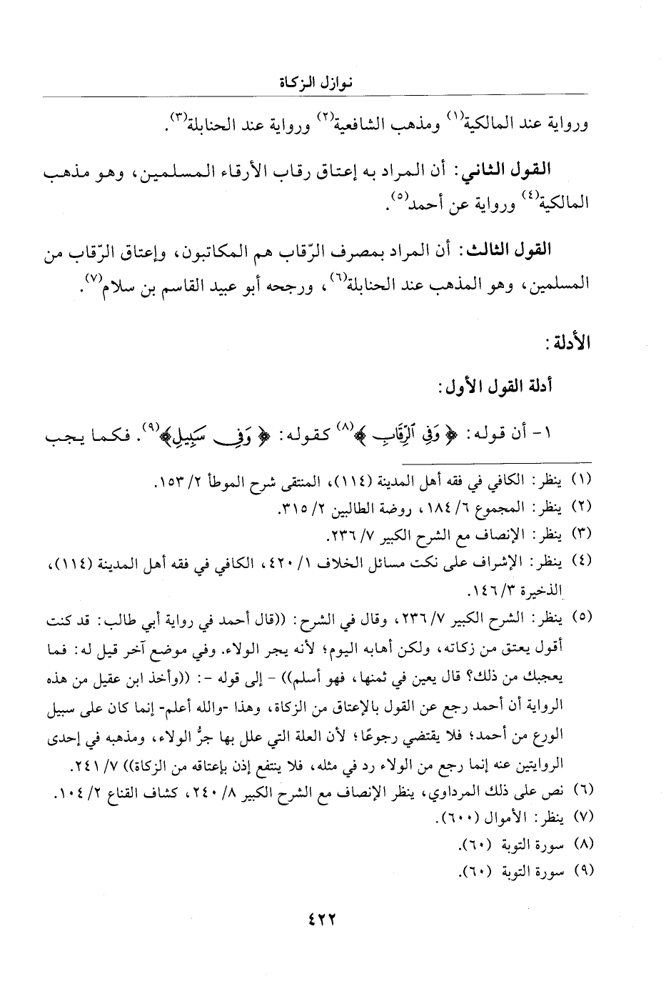 (¬5) ينظر: الشرح الكبير 7/ 236، وقال في الشرح: "قال أحمد في رواية أبي طالب: قد كنت أقول يعتق من زكاته، ولكن أهابه اليوم؛ لأنه يجر الولاء. وفي موضع آخر قيل له: فما يعجبك من ذلك؟ قال يعين في ثمنها، فهو أسلم" - إلى قوله -: "وأخذ ابن عقيل من هذه الرواية أن أحمد رجع عن القول بالإعتاق من الزكاة، وهذا - والله أعلم - إنما كان على سبيل الورع من أحمد؛ فلا يقتضي رجوعًا؛ لأن العلة التي علل بها جرّ الولاء، ومذهبه في إحدى الروايتين عنه إنما رجع من الولاء رد في مثله، فلا ينتفع إذن بإعتاقه من الزكاة" 7/ 241.