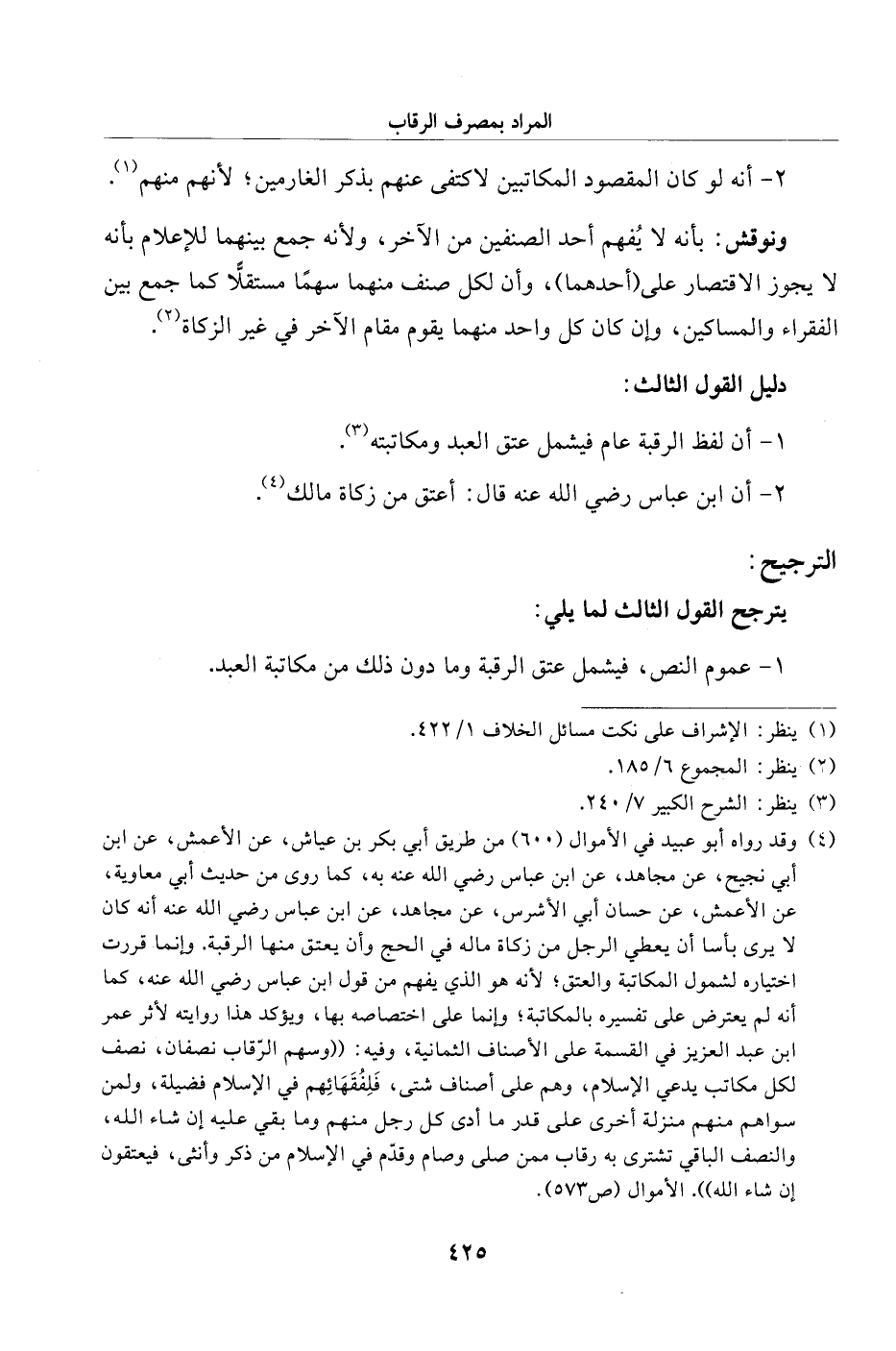 (¬4) وقد رواه أبو عبيد في الأموال (600) من طريق أبي بكر بن عياش، عن الأعمش، عن ابن أبي نجيح، عن مجاهد، عن ابن عباس رضي الله عنه به، كما روى من حديث أبي معاوية، عن الأعمش، عن حسان أبي الأشرس، عن مجاهد، عن ابن عباس رضي الله عنه أنه كان لا يرى بأسا أن يعطي الرجل من زكاة ماله في الحج وأن يعتق منها الرقبة. وإنما قررت اختياره لشمول المكاتبة والعتق؛ لأنه هو الذي يفهم من قول ابن عباس رضي الله عنه، كما أنه لم يعترض على تفسيره بالمكاتبة؛ وإنما على اختصاصه بها، ويؤكد هذا روايته لأثر عمر ابن عبد العزيز في القسمة على الأصناف الثمانية، وفيه: "وسهم الرّقاب نصفان، نصف لكل مكاتب يدعي الإسلام، وهم على أصناف شتى، فَلِفُقَهَائِهم في الإسلام فضيلة، ولمن سواهم منهم منزلة أخرى على قدر ما أدى كل رجل منهم وما بقي عليه إن شاء الله، والنصف الباقي تشترى به رقاب ممن صلى وصام وقدّم في الإسلام من ذكر وأنثى، فيعتقون إن شاء الله". الأموال (ص 573).