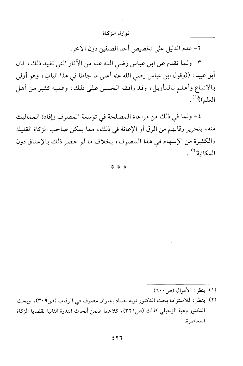 (¬2) ينظر: للاستزادة بحث الدكتور نزيه حماد بعنوان مصرف في الرقاب (ص 309)، وبحث الدكتور وهبة الزحيلي كذلك (ص 321)، كلاهما ضمن أبحاث الندوة الثانية لقضايا الزكاة المعاصرة.