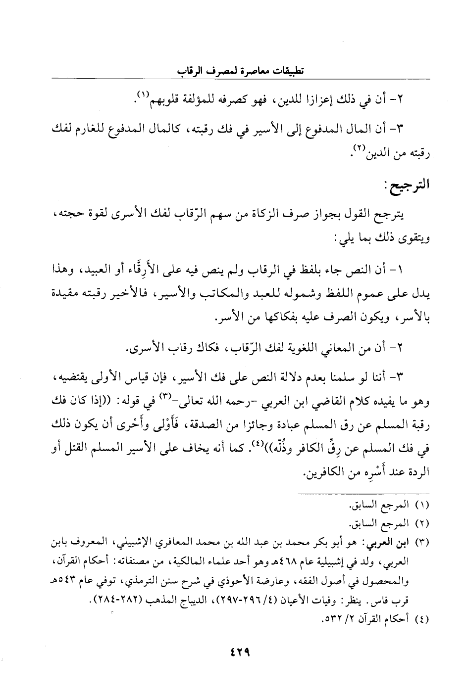 3 - أننا لو سلمنا بعدم دلالة النص على فك الأسير، فإن قياس الأولى يقتضيه، وهو ما يفيده كلام القاضي ابن العربي -رحمه الله تعالى - (¬3) في قوله: "إذا كان فك رقبة المسلم عن رق المسلم عبادة وجائزا من الصدقة، فَأَوْلى وأَحْرى أن يكون ذلك في فك المسلم عن رِقّ الكافر وذُلّه" (¬4). كما أنه يخاف على الأسير المسلم القتل أو الردة عند أَسْرِه من الكافرين.