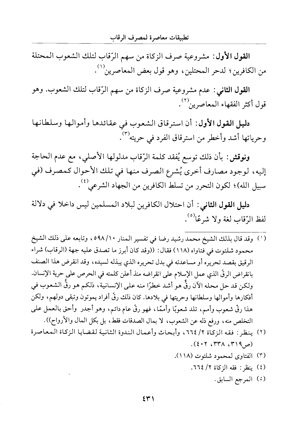 (¬1) وقد قال بذلك الشيخ محمد رشيد رضا في تفسير المنار 10/ 598، وتابعه على ذلك الشيخ محمود شلتوت في فتاواه (118) فقال: "وقد كان أخبرني ما تصدق عليه جهة (الرقاب) شراء الرقيق بقصد تحريره أو مساعدته في بدل تحريره الذي يبذله لسيده، وقد انقرض هذا الصنف بانقراض الرقّ الذي عمل الإسلام على انقراضه منذ أعلن كلمته في الحرص على حرية الإنسان. ولكن قد حل محله الآن رقٌّ هو أشد خطرًا منه على الإنسانية، ذلكم هو رقُّ الشعوب في أفكارها وأموالها وسلطانها وحريتها في بلادها. كان ذلك رقّ أفراد يموتون وتبقى دولهم، ولكن هذا رقّ شعوب وأمم، تلد شعوبًا وأممًا، فهو رقّ عام دائم، وهو أجدر وأحق بالعمل على التخلص منه، ورفع ذله عن الشعوب، لا بمال الصدقات فقط، بل بكل المال والأرواح".