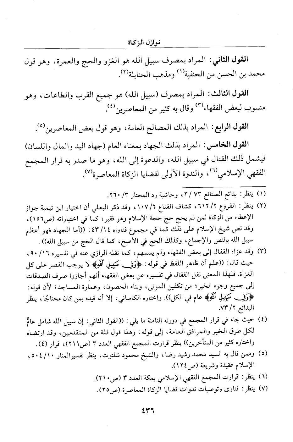 القول الخامس: المراد بذلك الجهاد بمعناه العام (جهاد اليد والمالك واللسان) فيشمل ذلك القتال في سبيل الله، والدعوة إلى الله، وهو ما صدر به قرار المجمع الفقهي الإسلامي (¬6)، والندوة الأولى لقضايا الزكاة المعاصرة (¬7).