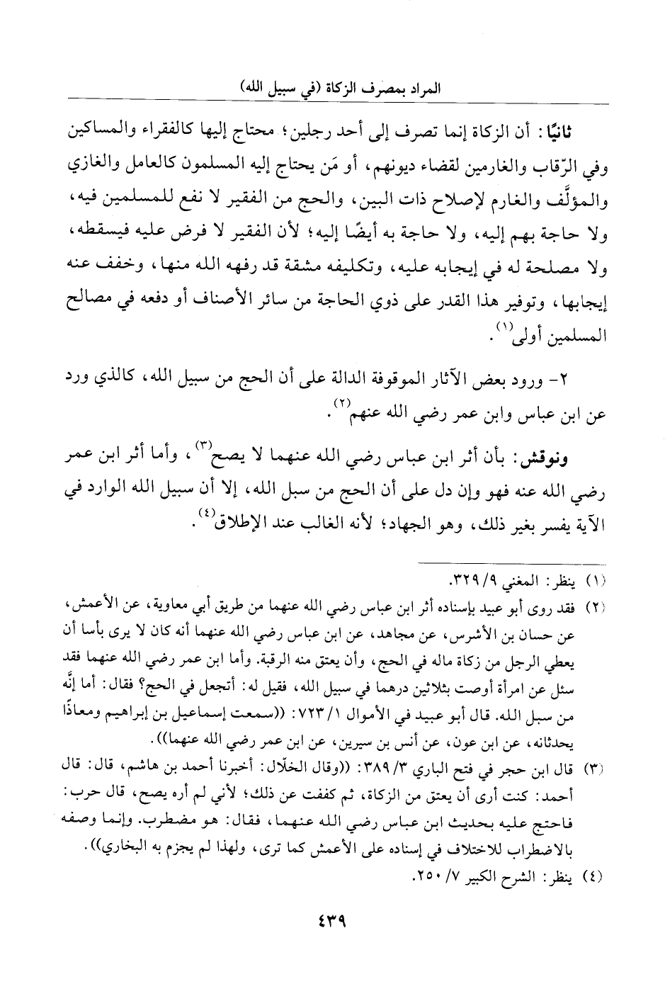 ونوقش: بأن أثر ابن عباس رضي الله عنهما لا يصح (¬3)، وأما أثر ابن عمر رضي الله عنه فهو وإن دل على أن الحج من سبل الله، إلا أن سبيل الله الوارد في الآية يفسر بغير ذلك، وهو الجهاد، لأنه الغالب عند الإطلاق (¬4).