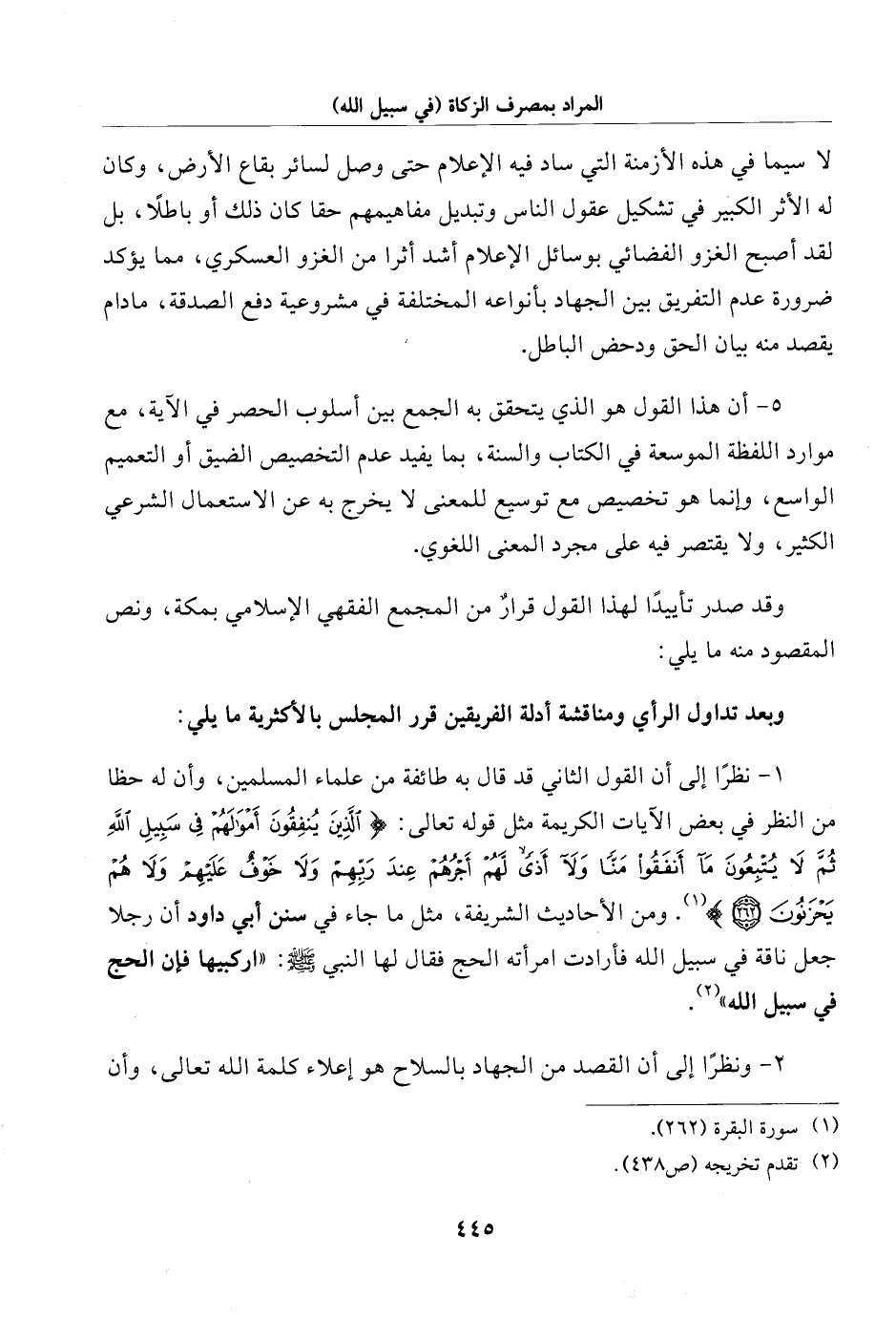 ومن الأحاديث الشريفة، مثل ما جاء في سنن أبي داود أن رجلا جعل ناقة في سبيل الله فأرادت امرأته الحج فقال لها النبي - صلى الله عليه وسلم -: "اركبيها فإن الحج في سبيل الله" (¬2).