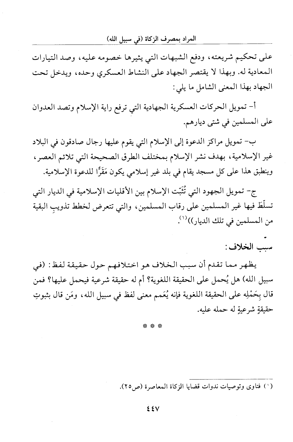 يظهر مما تقدم أن سبب الخلاف هو اختلافهم حول حقيقة لفظ: (في سبيل الله) هل يُحمل على الحقيقة اللغوية؟ أم له حقيقة شرعية فيحمل عليها؟ فمن قال بِحَمْلِه على الحقيقة اللغوية فإنه يُعَمم معنى لفظ في سبيل الله، ومَن قال بثبوتِ حقيقةٍ شرعيةٍ له حمله عليه.