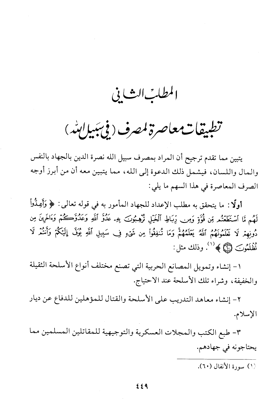 أولًا: ما يتحقق به مطلب الإعداد للجهاد المأمور به في قوله تعالى: {وَأَعِدُّوا لَهُمْ مَا اسْتَطَعْتُمْ مِنْ قُوَّةٍ وَمِنْ رِبَاطِ الْخَيْلِ تُرْهِبُونَ بِهِ عَدُوَّ اللَّهِ وَعَدُوَّكُمْ وَآخَرِينَ مِنْ دُونِهِمْ لَا تَعْلَمُونَهُمُ اللَّهُ يَعْلَمُهُمْ وَمَا تُنْفِقُوا مِنْ شَيْءٍ فِي سَبِيلِ اللَّهِ يُوَفَّ إِلَيْكُمْ وَأَنْتُمْ لَا تُظْلَمُونَ (60)} [الأنفال: 60] (¬1).