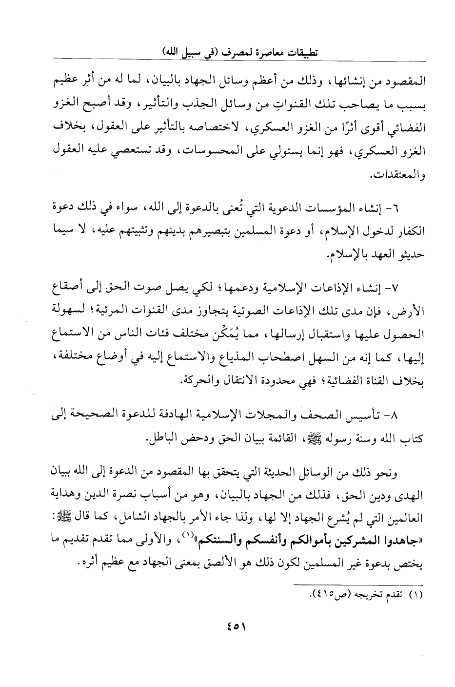 ونحو ذلك من الوسائل الحديثة التي يتحقق بها المقصود من الدعوة إلى الله ببيان الهدى ودين الحق، فذلك من الجهاد بالبيان، وهو من أسباب نصرة الدين وهداية العالمين التي لم يُشرع الجهاد إلا لها، ولذا جاء الأمر بالجهاد الشامل، كما قال - صلى الله عليه وسلم -: "جاهدوا المشركين بأموالكم وأنفسكم وألسنتكم " (¬1)، والأولى مما تقدم تقديم ما يختص بدعوة غير المسلمين لكون ذلك هو الألصق بمعنى الجهاد مع عظيم أثره.