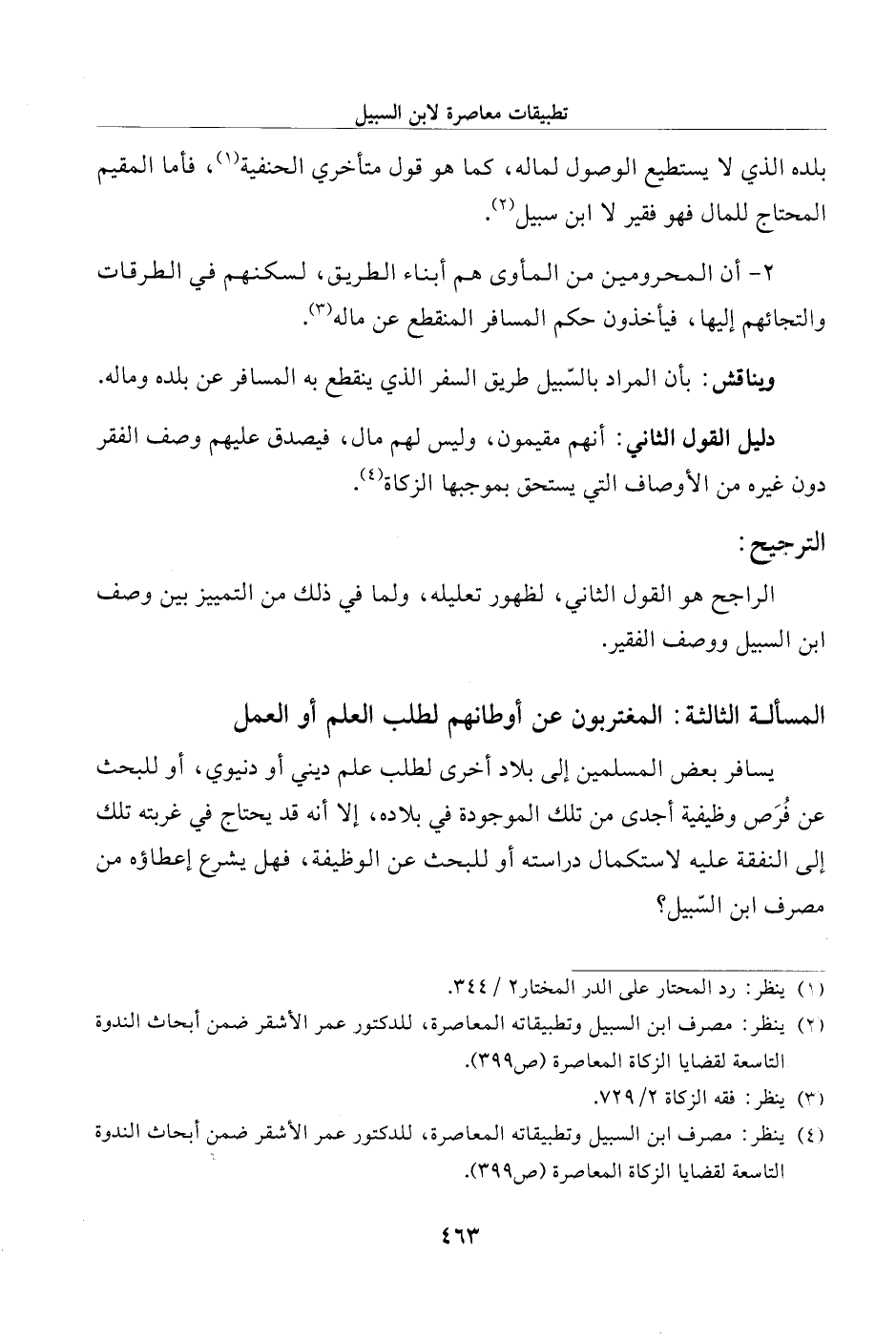 (¬4) ينظر: مصرف ابن السبيل وتطبيقاته المعاصرة، للدكتور عمر الأشقر ضمن أبحاث الندوة التاسعة لقضايا الزكاة المعاصرة (ص 399).